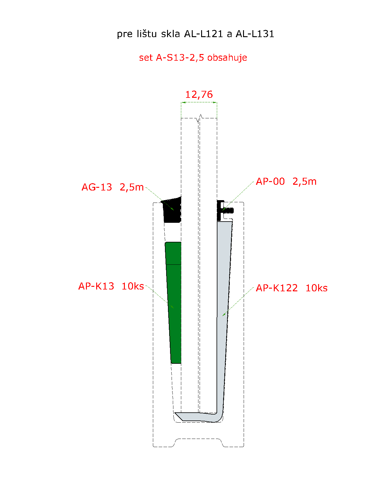 2,5 m set pro 12,76 mm sklo, k hliníkovým profilům AL-L121, AL-L131, AL-L141 a AL-L151