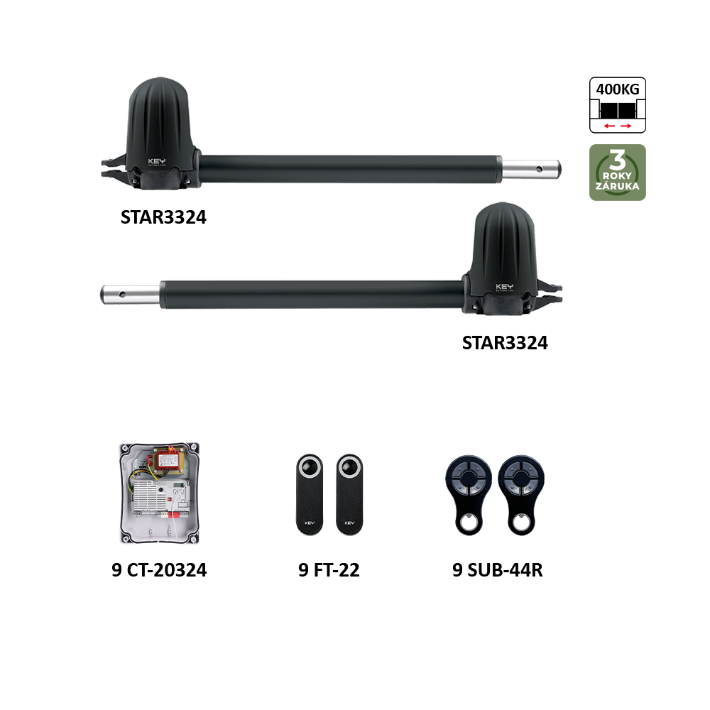 900KSTAR3324KS pro dvojkřídlovou bránu do 3m / křídlo, 2x STAR3324, 1x CT-20324, 2x SUB-44R, 1 pár FT22