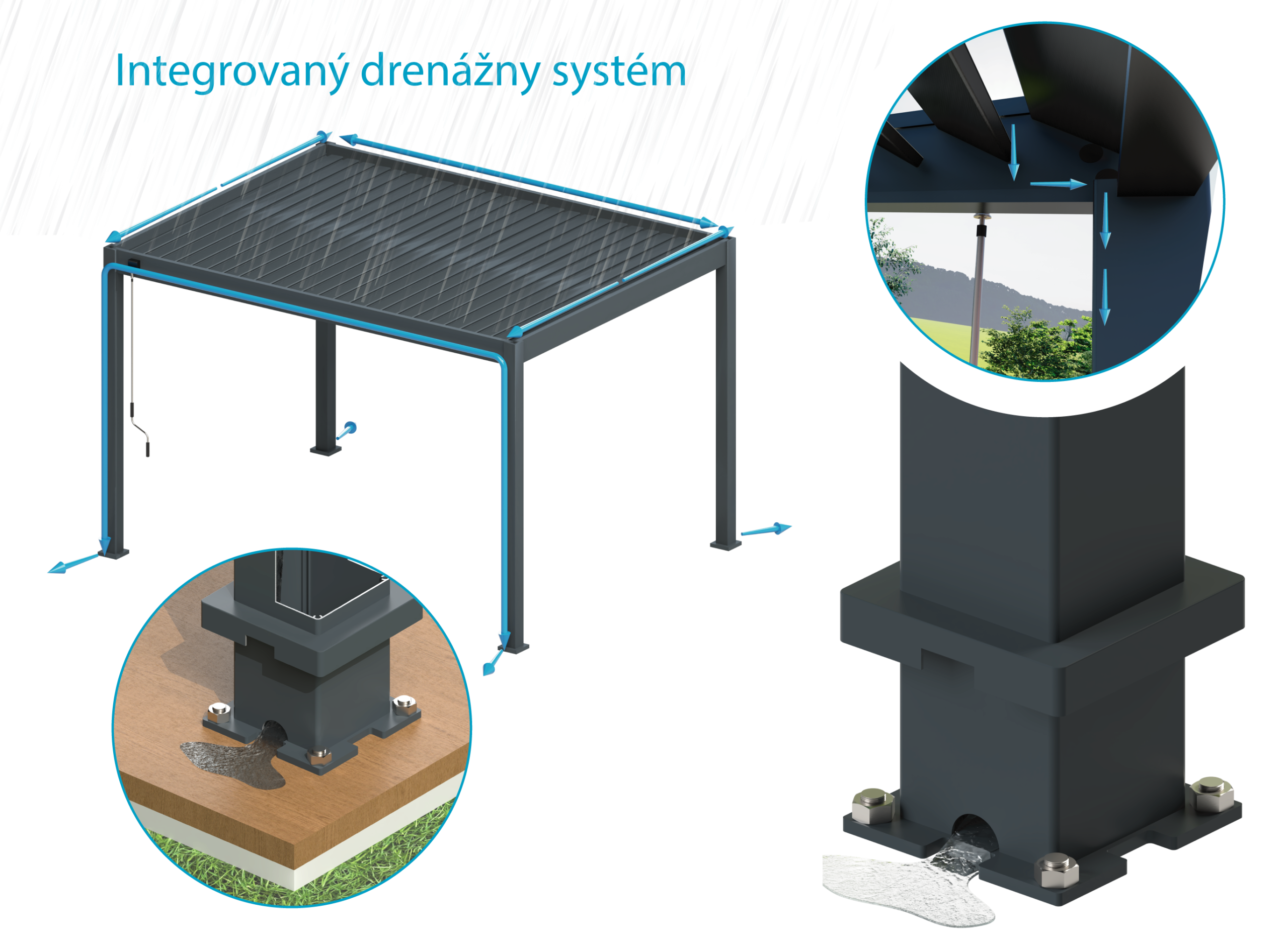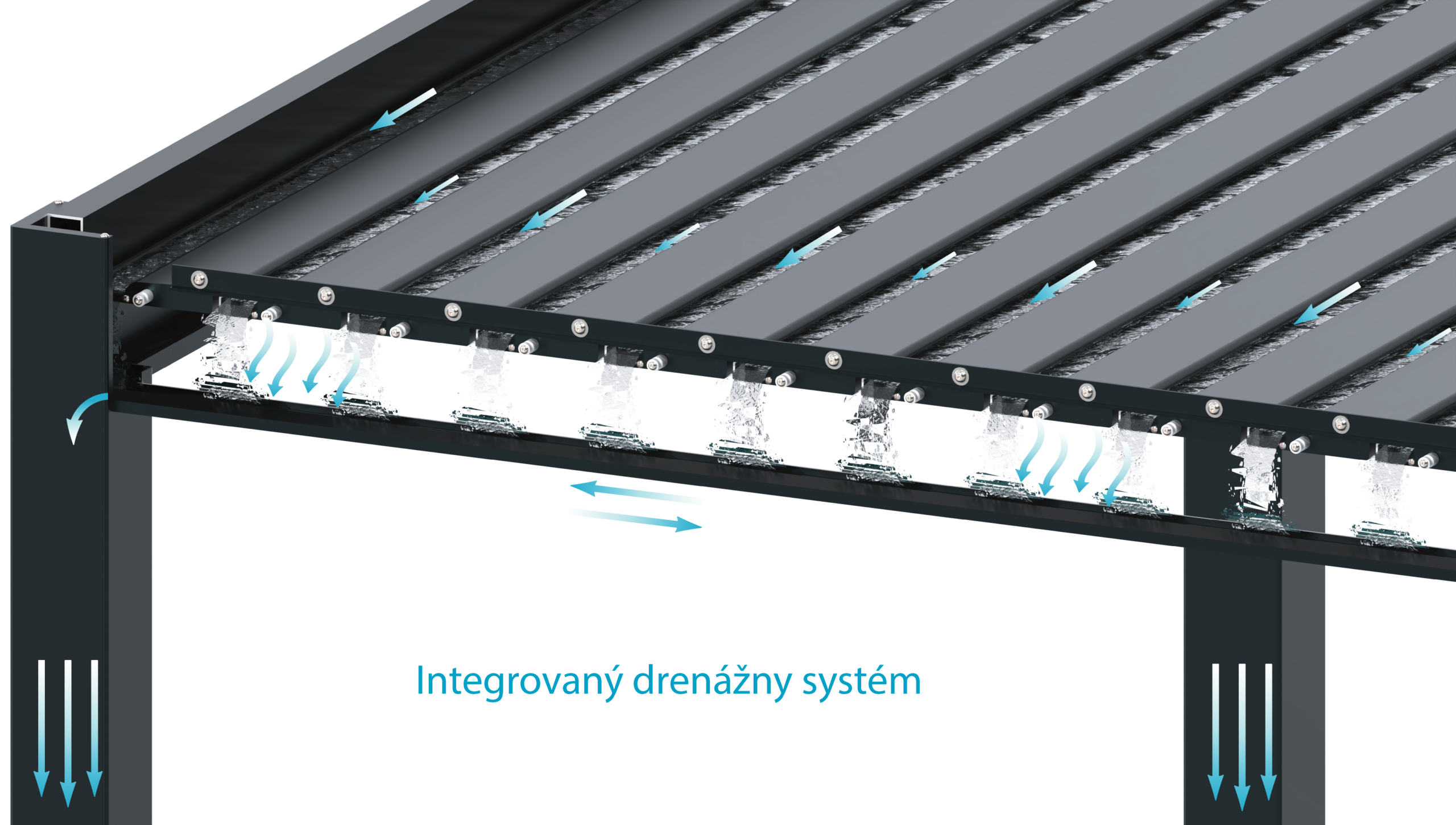 Voda je odváděna integrovaným drenážním systémem uvnitř konstrukce, takže si pergola poradí i se silnějším deštěm. Lamely dokážou odvést přibližně 17 l/m² za hodinu.