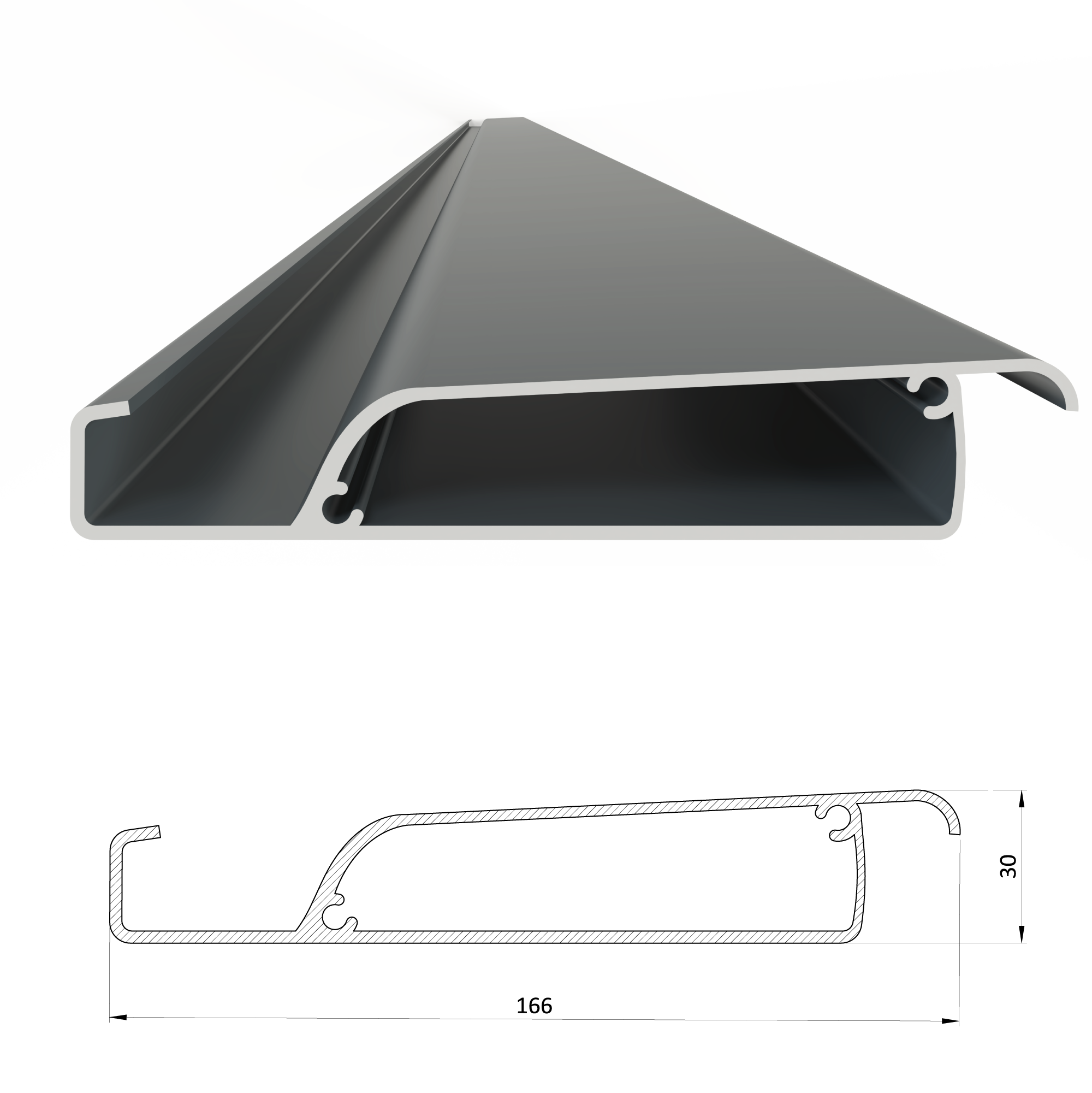 Horní hliníkový profil s lištou zakrývá lamely tak, že z bočního pohledu nepůsobí rušivě a tvoří jednotnou linii s konstrukcí.