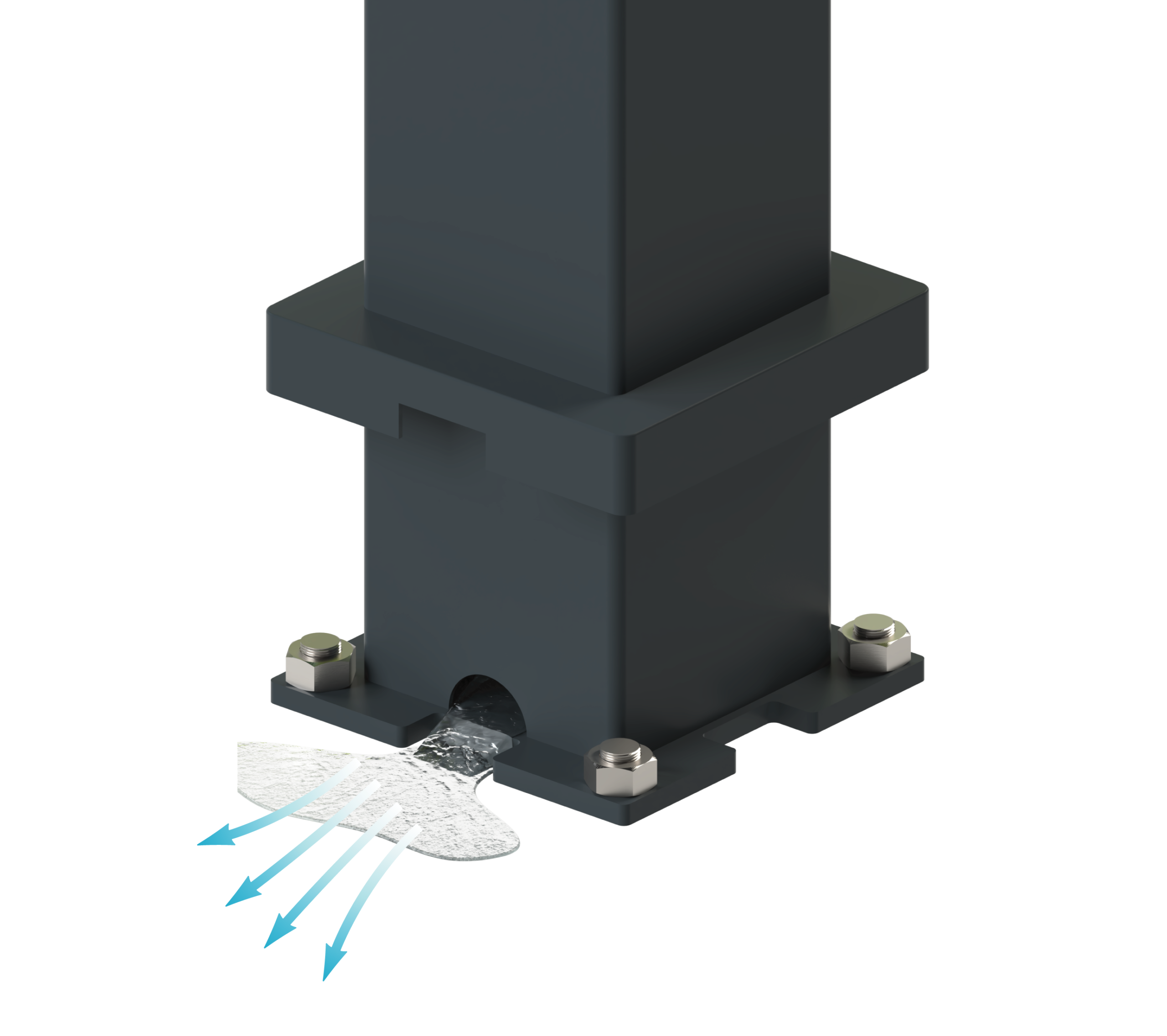 Nosné sloupy mají rozměr 116 × 116 mm. Při instalaci je třeba počítat s ocelovou patkou 160 × 160 mm (tloušťka 8 mm), zakrytou hliníkovým krytem 165 × 165 mm s integrovaným odvodněním.