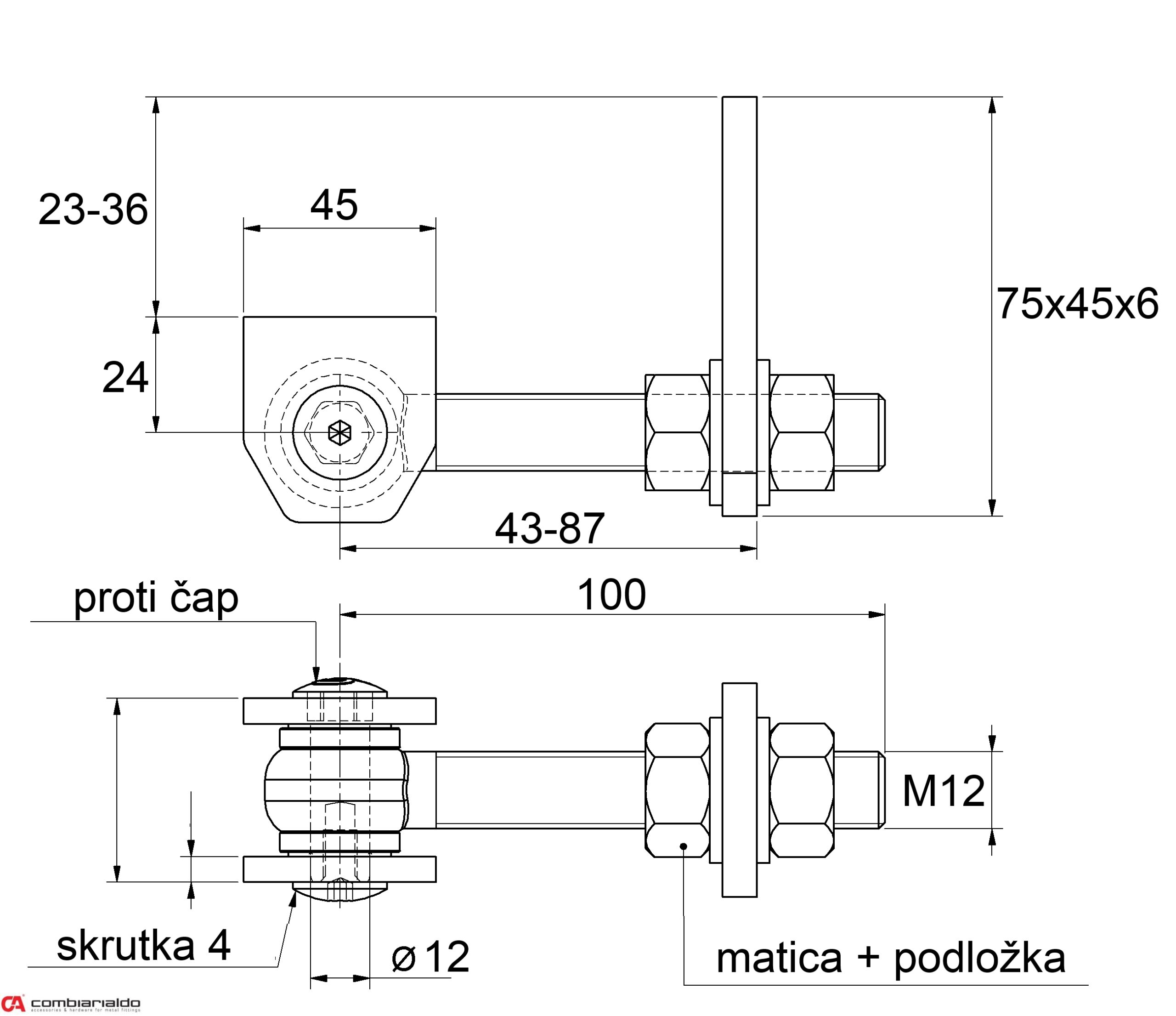 Regulovateľný, navárací bočný záves-pant, závit M12 od popredného talianského výrobcu Combi Arialdo. Povrchová úprava- pozink, 2x časť v tvare D /prizvára sa na krídlo brány/ a časť v tvare I /prizvára sa na stĺp/ - bez povrcovej úpravy. Použitie pre ľahké brány.