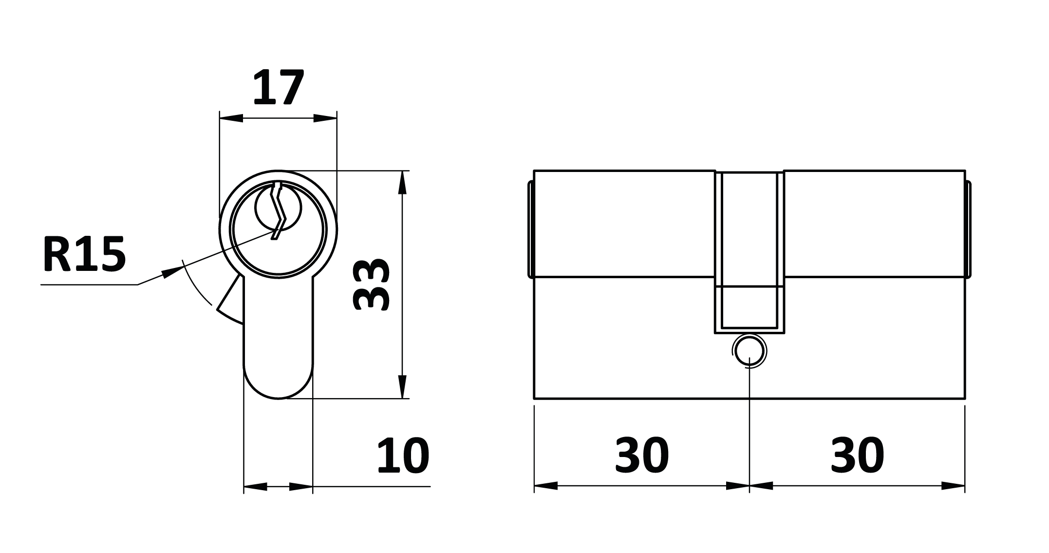 Cylindrická vložka 30x30 mm, niklová, 3 klíče, šroub M5x65 mm