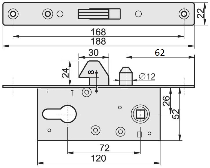 Hákový zámek na posuvnou bránu, hloubka 60 mm, rozteč 72 mm