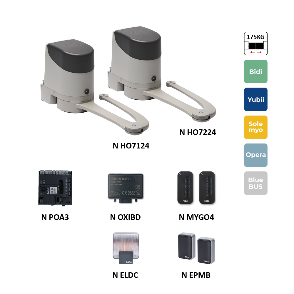 HOPPBDKCE sada pákových pohonů pro dvoukřídlou bránu do 2,4 m / křídlo, 1x HO7124 s POA3, 1x HO7224, 2x MYGO4, 1x OXIBD, 1 pár EPMB, 1x ELDC