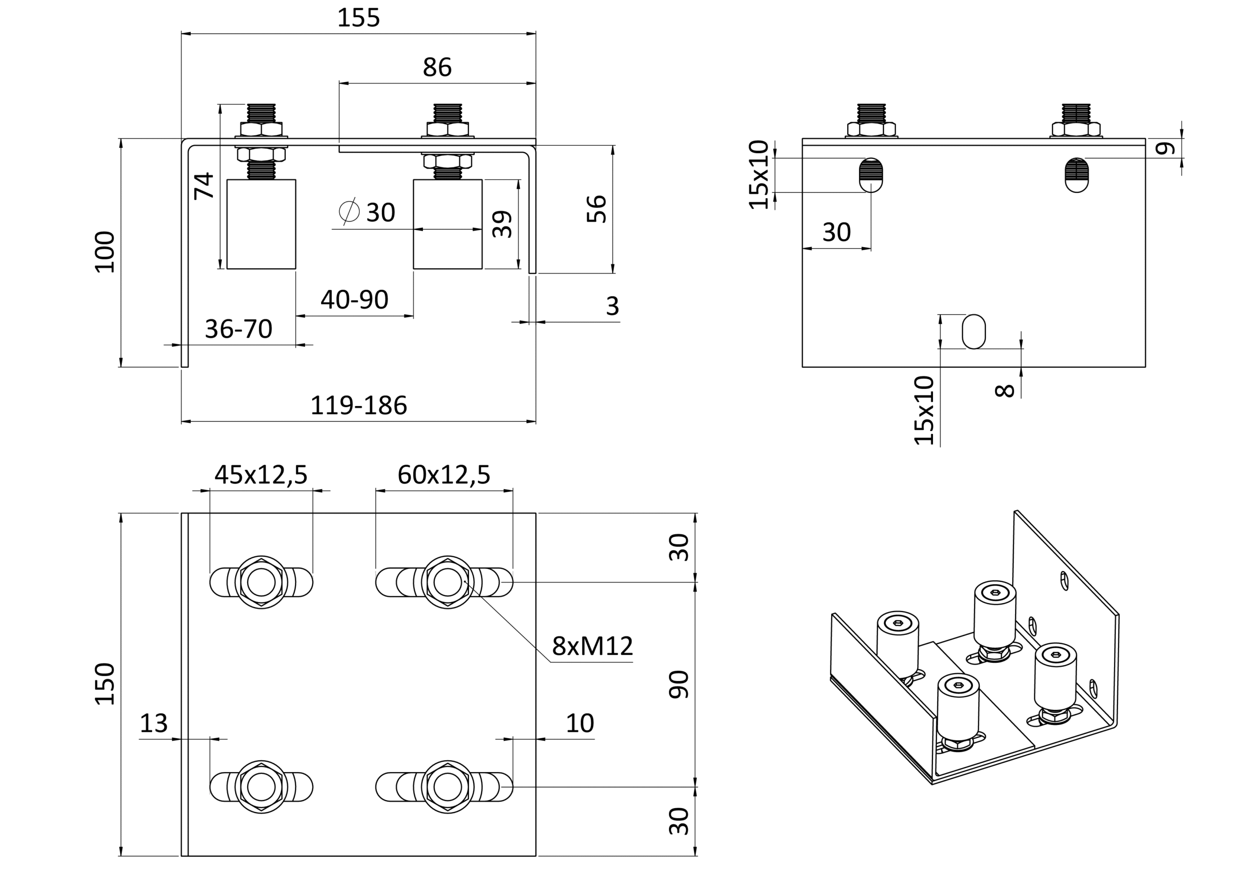 Horní vedení brány, nastavitelné pro profil 10-85mm, 4x nylon. kolečka D30mm H40mm