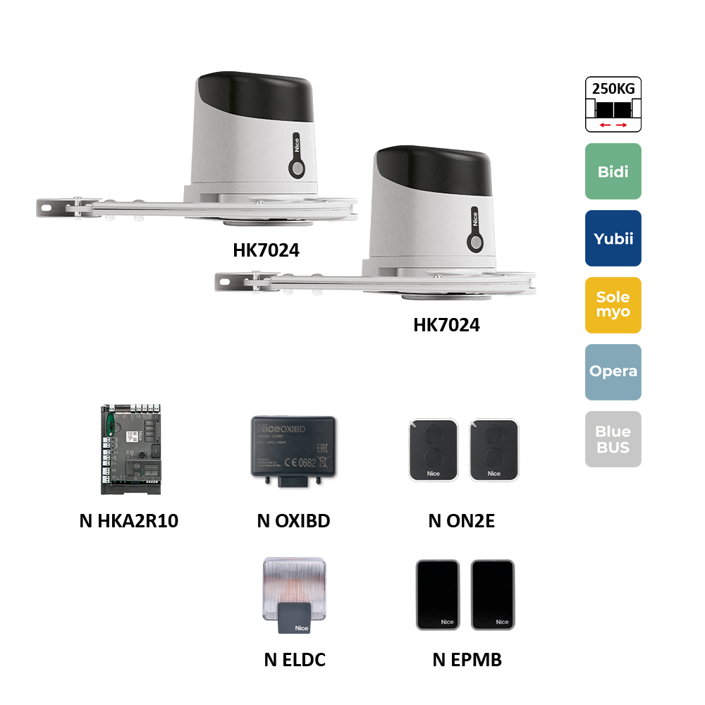 HYKEBDKCE sada pákových pohonů pro dvoukřídlou bránu do 3,5 m / křídlo, 1x HK7224, 1x HK7024 s řídicí jednotkou HKA1, 2x ON2E, 1x OXIBD, 1 pár EPMB, 1x ELDC
