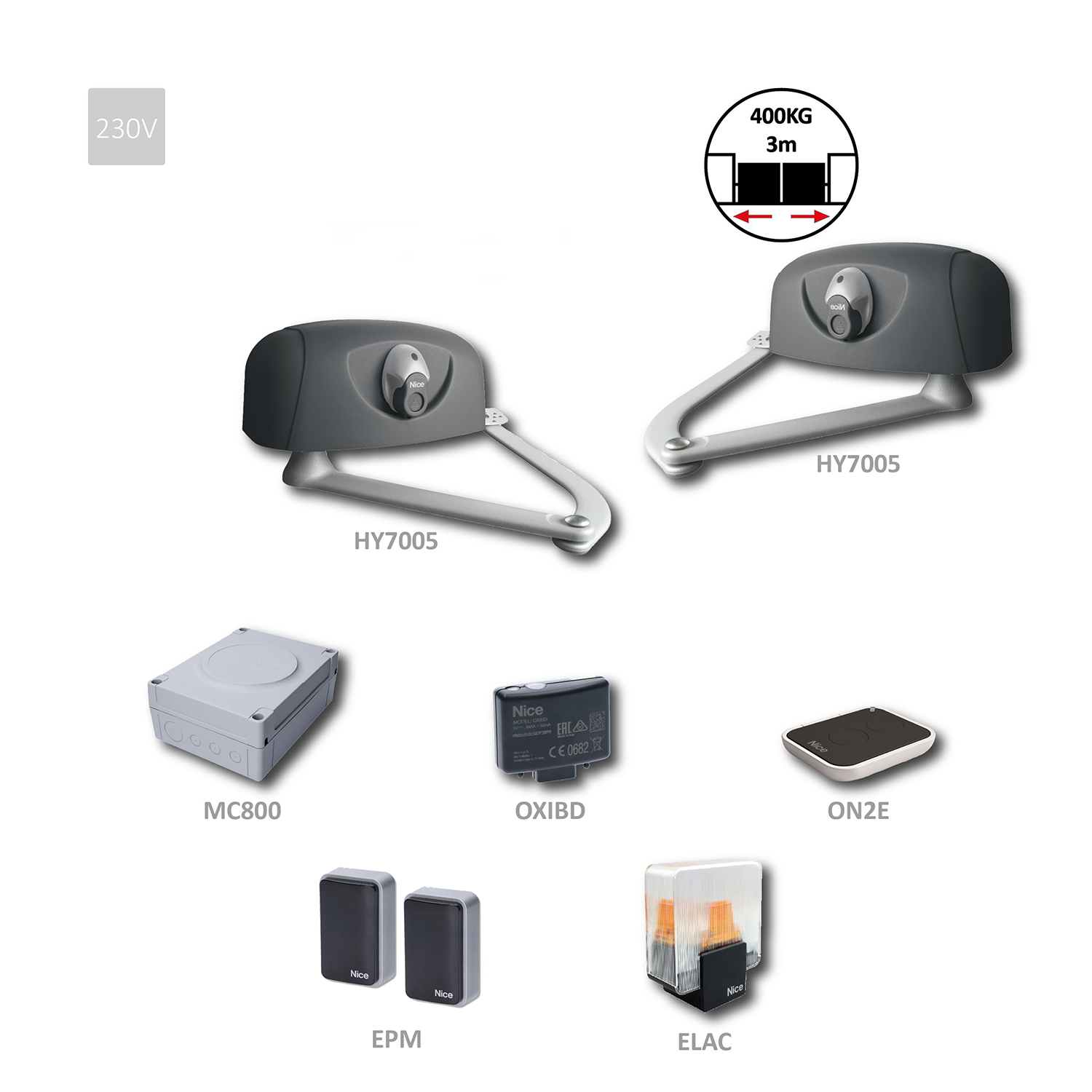 Sada pákových pohonů pro dvoukřídlou bránu do 3m / křídlo, 2x HY7005, 1x MC800, 1x ON2E, 1x OXIBD, 1 pár EPM, 1x ELAC