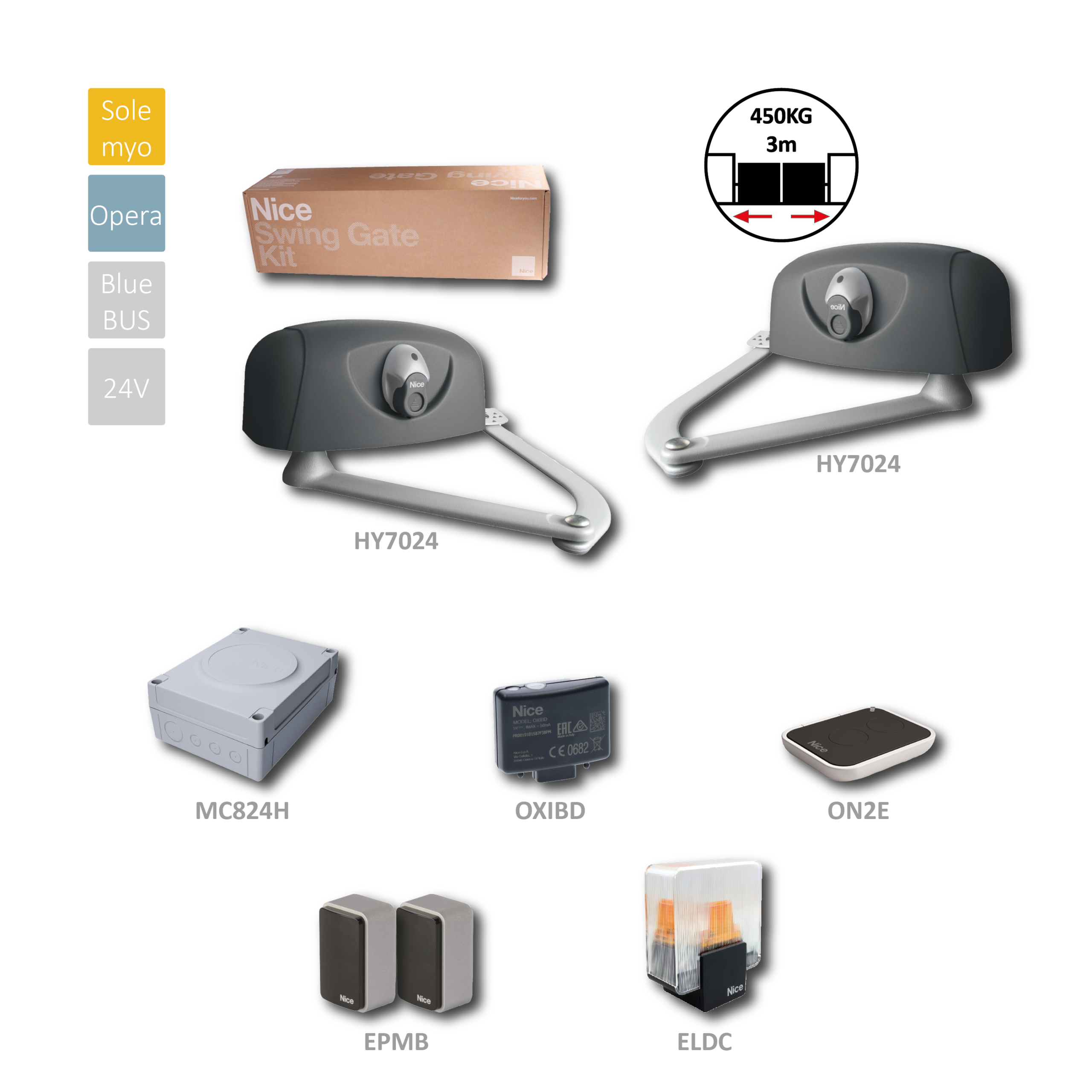 Sada pákových pohonů pro dvoukřídlou bránu do 3m/křídla, 2x HY7024, 1x MC824H, 1x OXIBD, 1pár EPMB, 1x ON2E, 1x ELDC