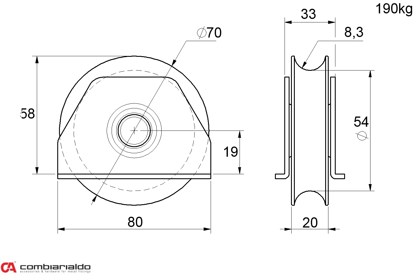 Kladka ø 70 mm na přivaření Combi Arialdo, C902/16 profil, nosnost 190 kg