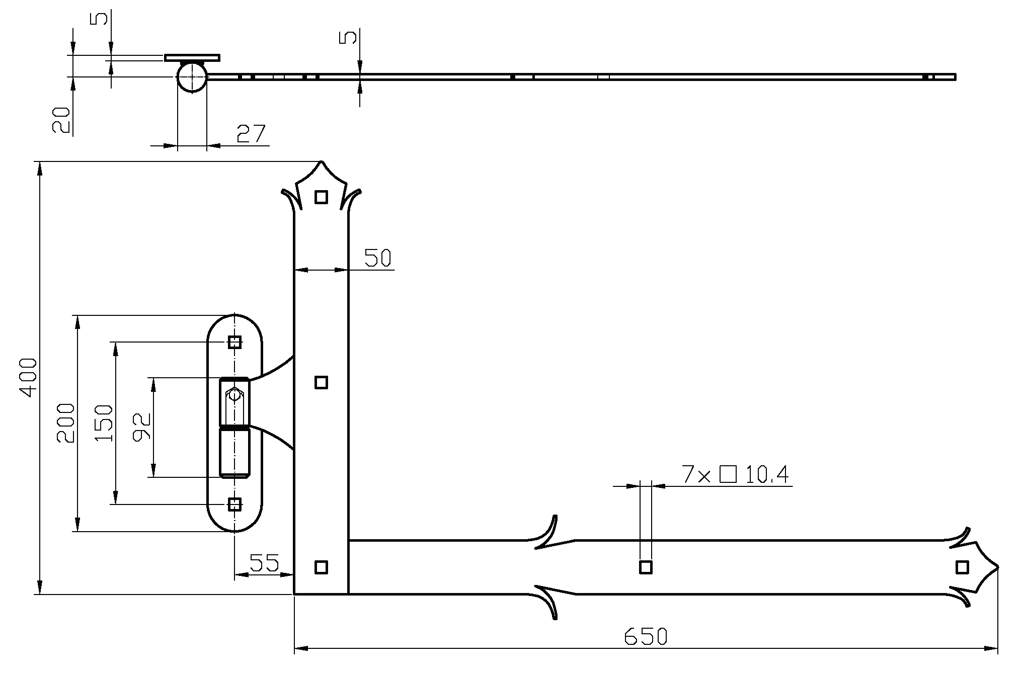 Kování ozdobné SPODNÍ, 400x650mm s čapom, profil 50x5mm, černá barva