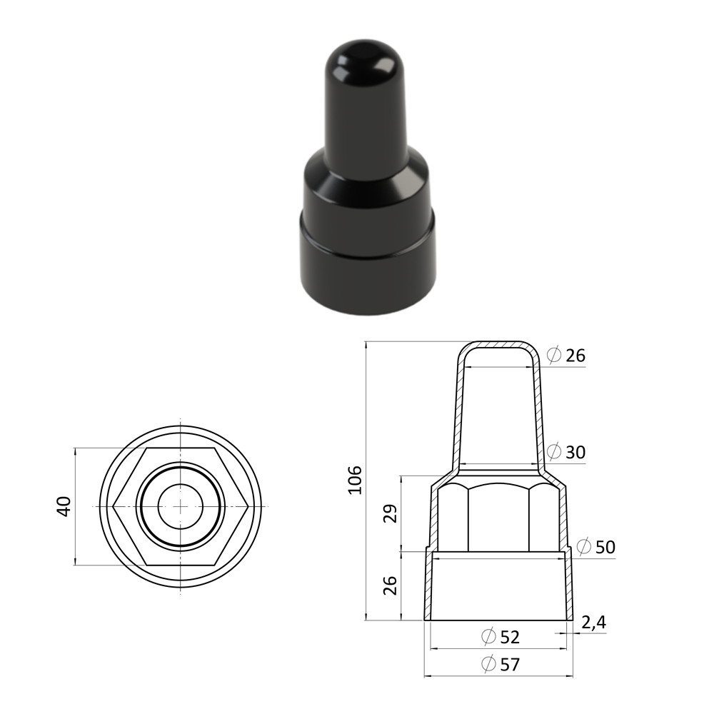 Krytka plastová na matice a šrouby M24, prodloužená, černá