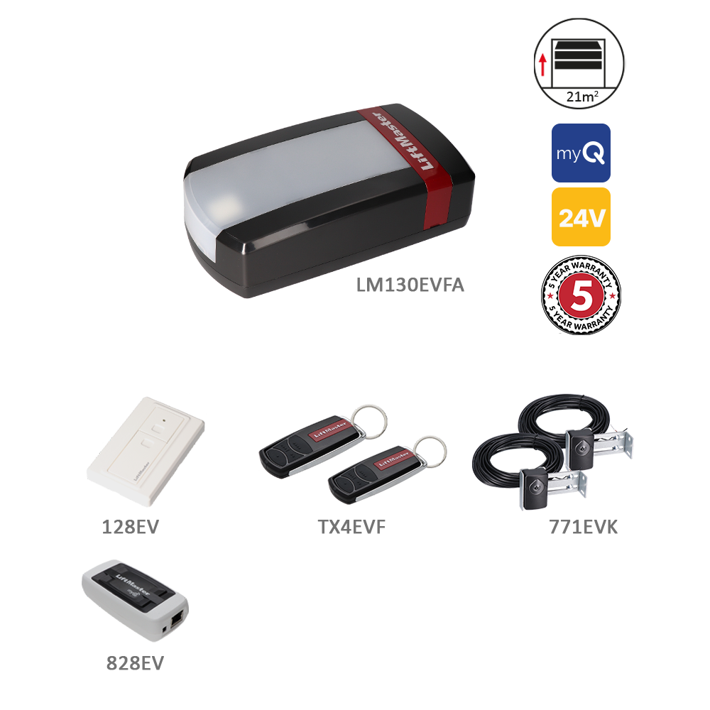 LiftMaster LM130EVFA je tichý, rychlý a spolehlivý pohon pro sekční garážová vrata do hmotnosti 200 kg a rozměrů až 6,0 m (šířka) × 3,5 m (výška). Pohon pracuje na 24 V DC a poskytuje maximální zdvihovou sílu 1300 N. Díky modernímu designu, nízké hlučnosti (