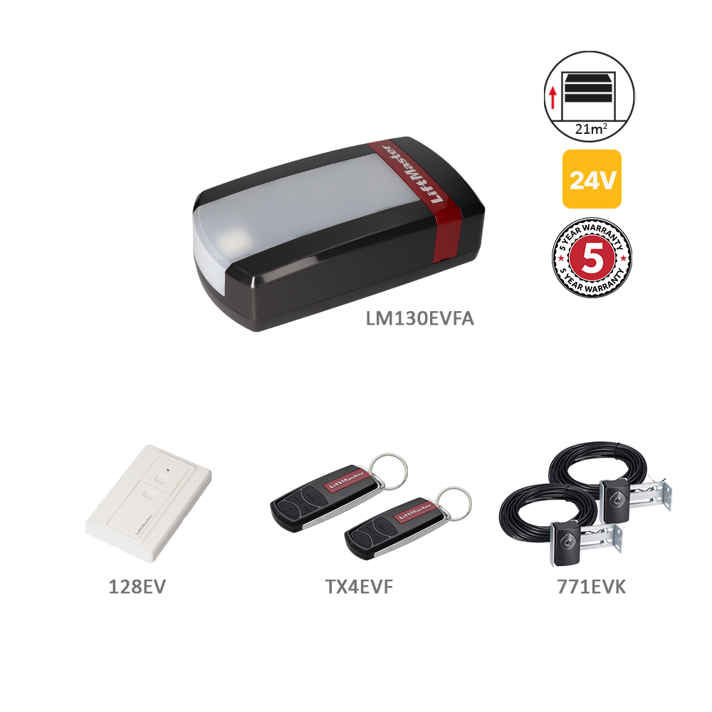 LiftMaster LM130EVFA je tichý, rychlý a spolehlivý pohon pro sekční garážová vrata do hmotnosti 200 kg a rozměrů až 6,0 m (šířka) × 3,5 m (výška). Pohon pracuje na 24 V DC a poskytuje maximální zdvihovou sílu 1300 N. Díky modernímu designu, nízké hlučnosti (