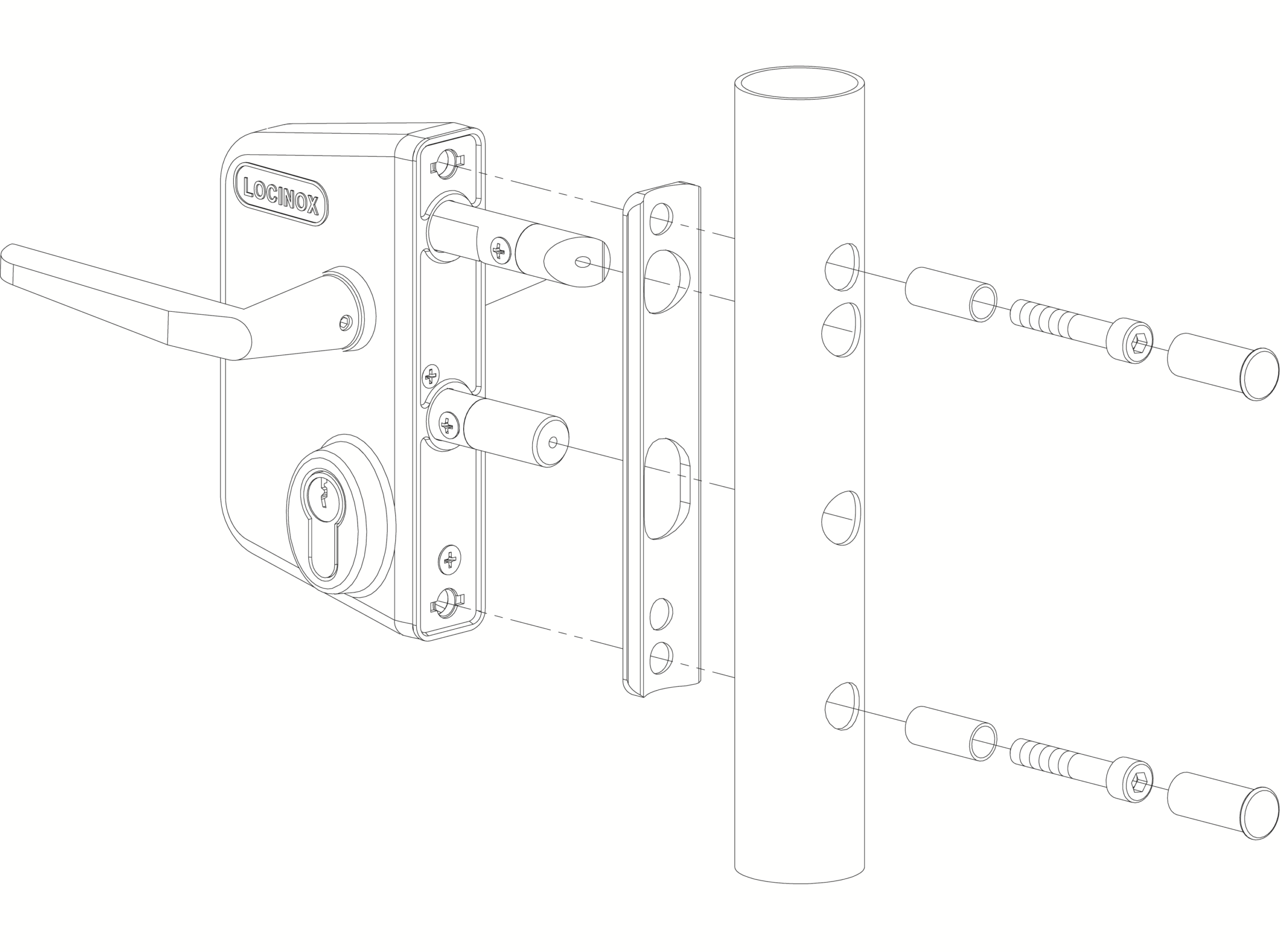 Vysoce kvalitní zámek s hliníkovou kazetou a mechanismem z nerezavějící oceli. Tento zámek řadíme jako standard pro všechna průmyslová vrata. Střelka zámku z nerezavějící oceli má regulovatelný výsuv (20 mm), nastavování střelky je bez nutnosti demontáže. Pro rychlou a přesnou montáž doporučujeme použít vrtací přípravek LOCINOX® Drill-Fix.