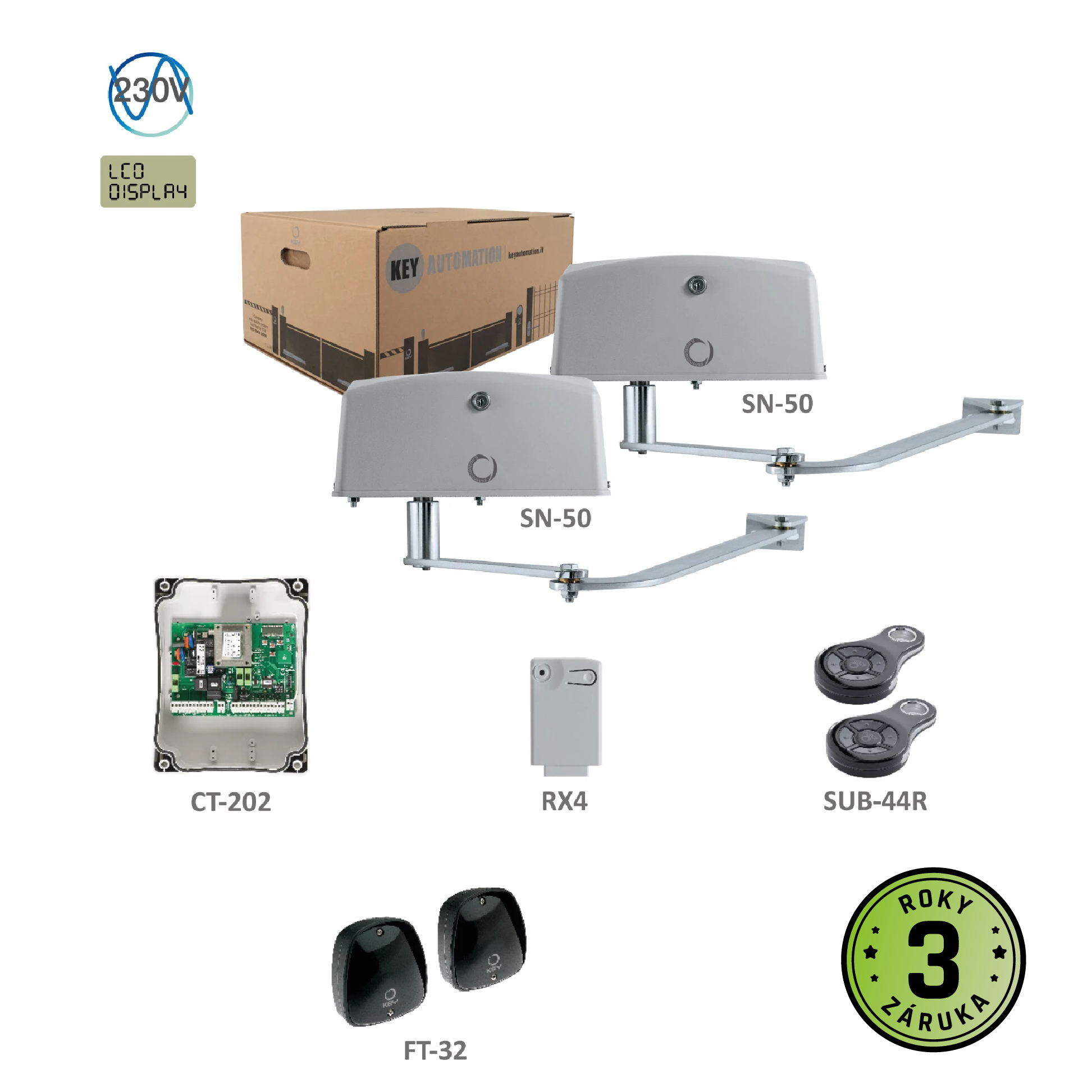 900KSN52KS - MEWAKIT3 sada pákových pohonů pro dvoukřídlou bránu do 4m/kř., 2x SN-50, 1x CT-202, 1x RX4, 1 pár FT-32, 2x SUB-44R