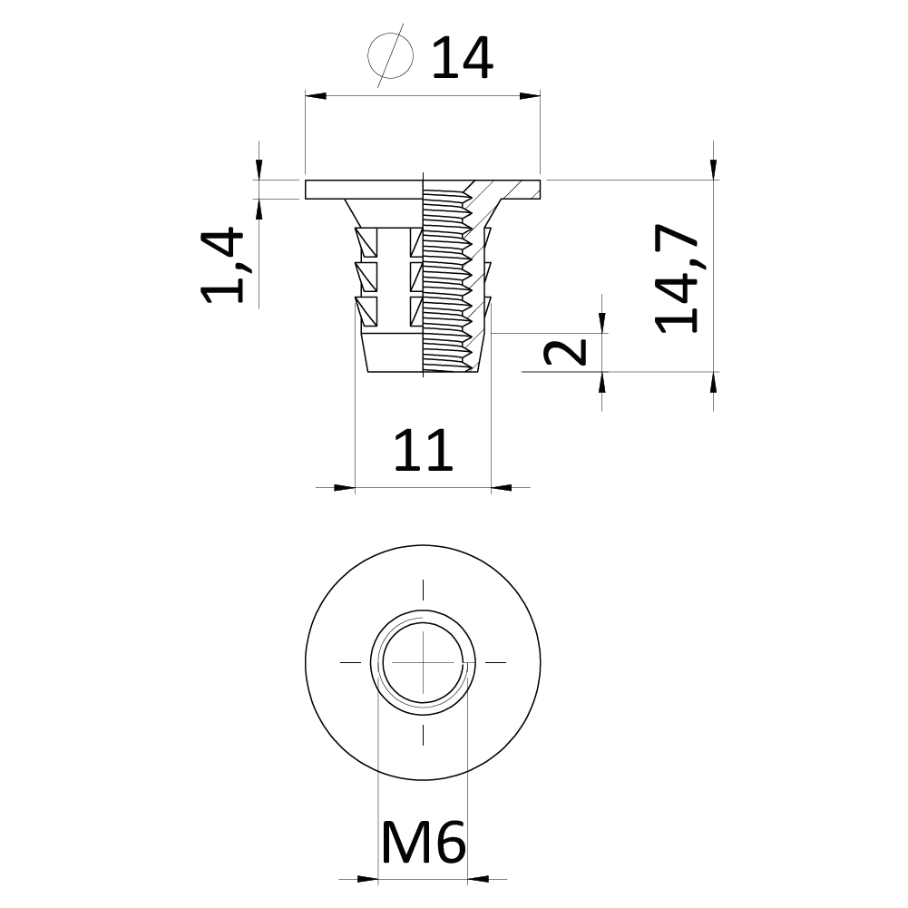 Narážecí matice do dřeva M6x14.7 s vnitřním metrickým závitem, zinková slitina