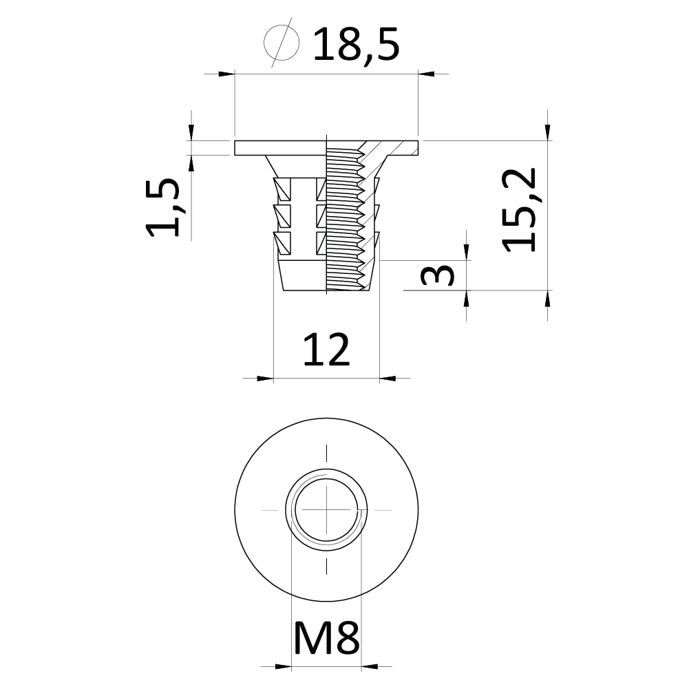 Narážecí matice do dřeva M8x15.2 s vnitřním metrickým závitem, zinková slitina