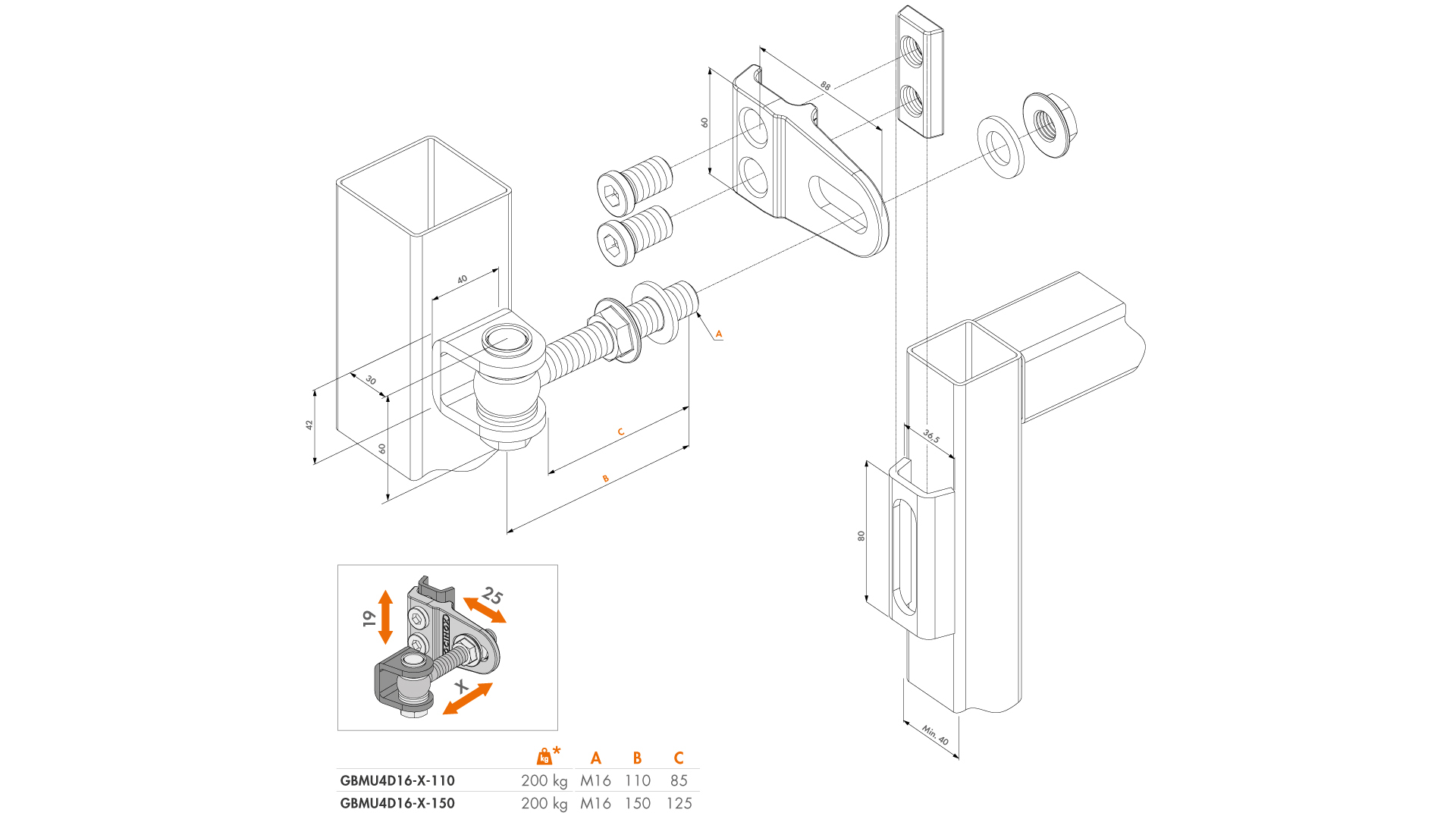 4-směrně nastavitelný, žárově pozinkovaný 180° pant. Hloubka a vzdálenost mezi bránou a sloupkem jsou nastavitelné po instalaci. Žádné další levé nebo pravé křídlové brány. Mělo by být vyrobeno jen jedno křídlo brány pro levé i pravé otáčivé brány. Části určené k navařování jsou v dispozici v černé oceli nebo pozinkované.