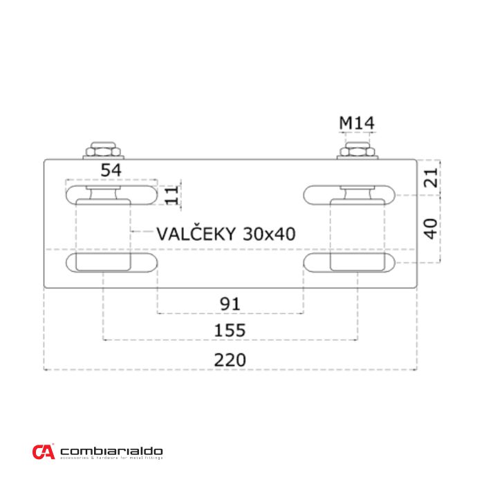 Nerezové horní vedení brány se 4 vodícími kladkami (30x40 mm/ M14), nerez AISI304.