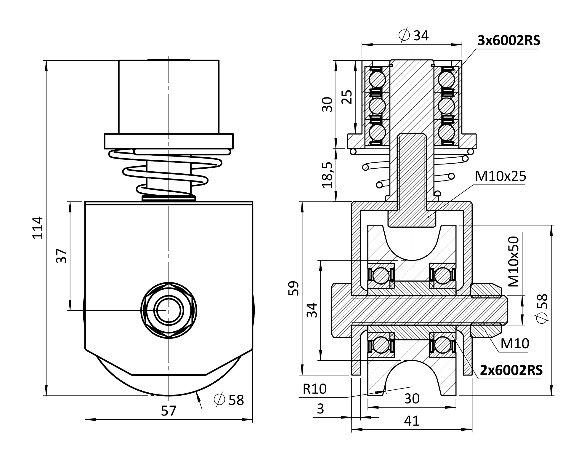 Otočné vodící kolečko 58mm, pro U profil ø20mm