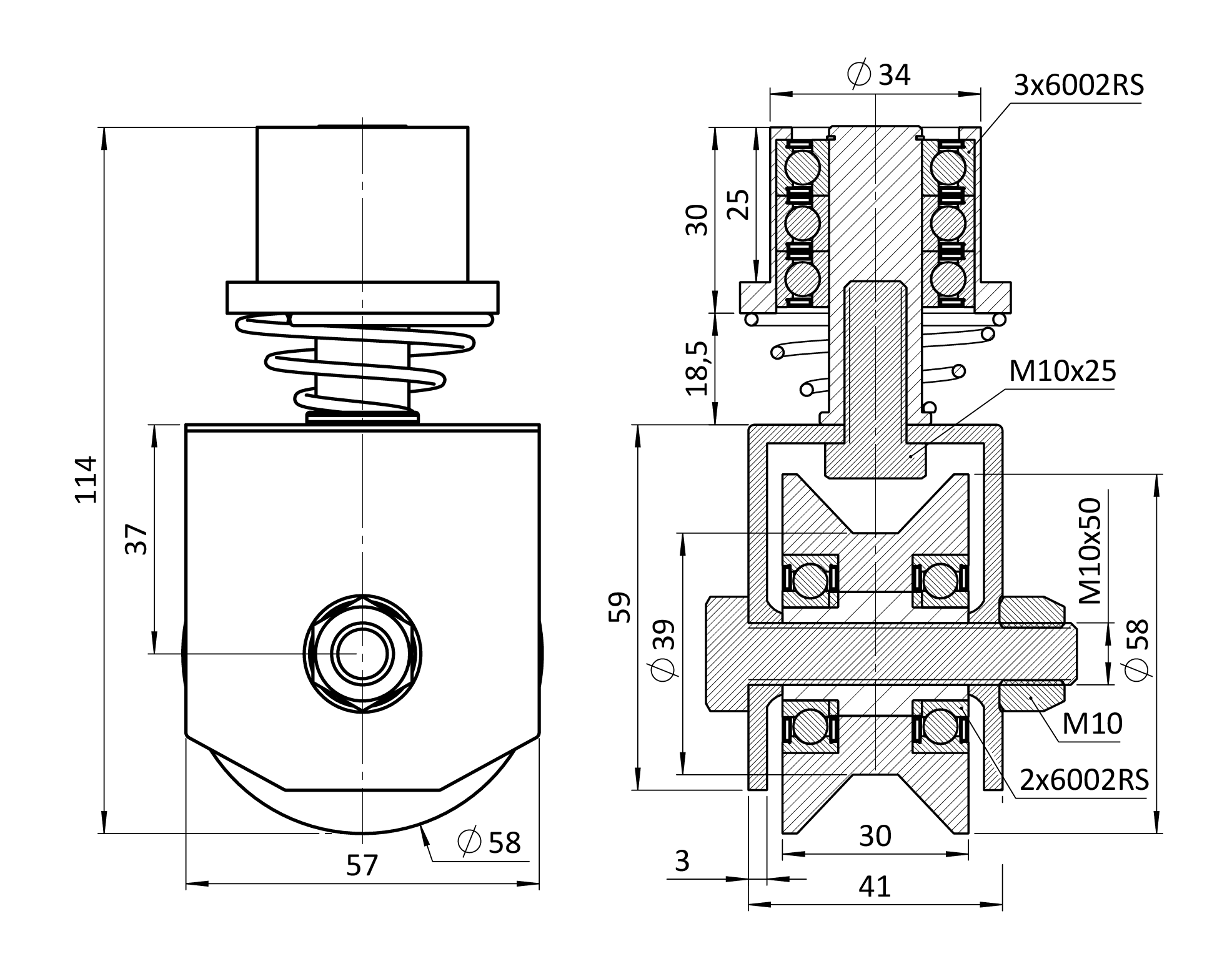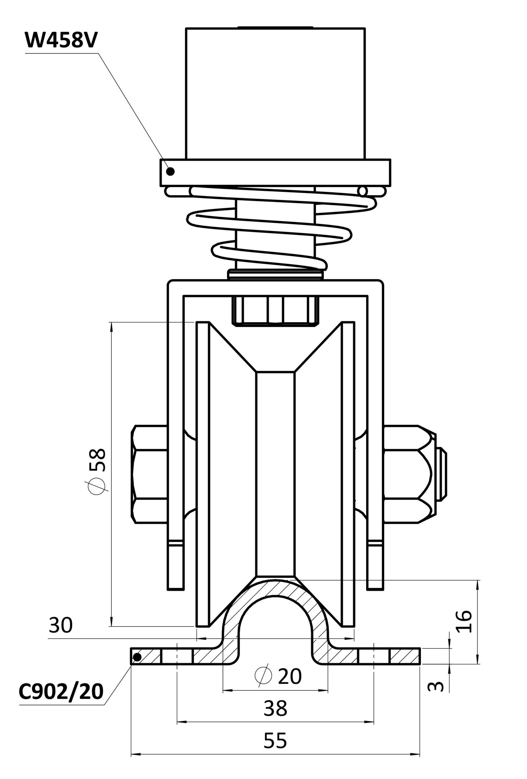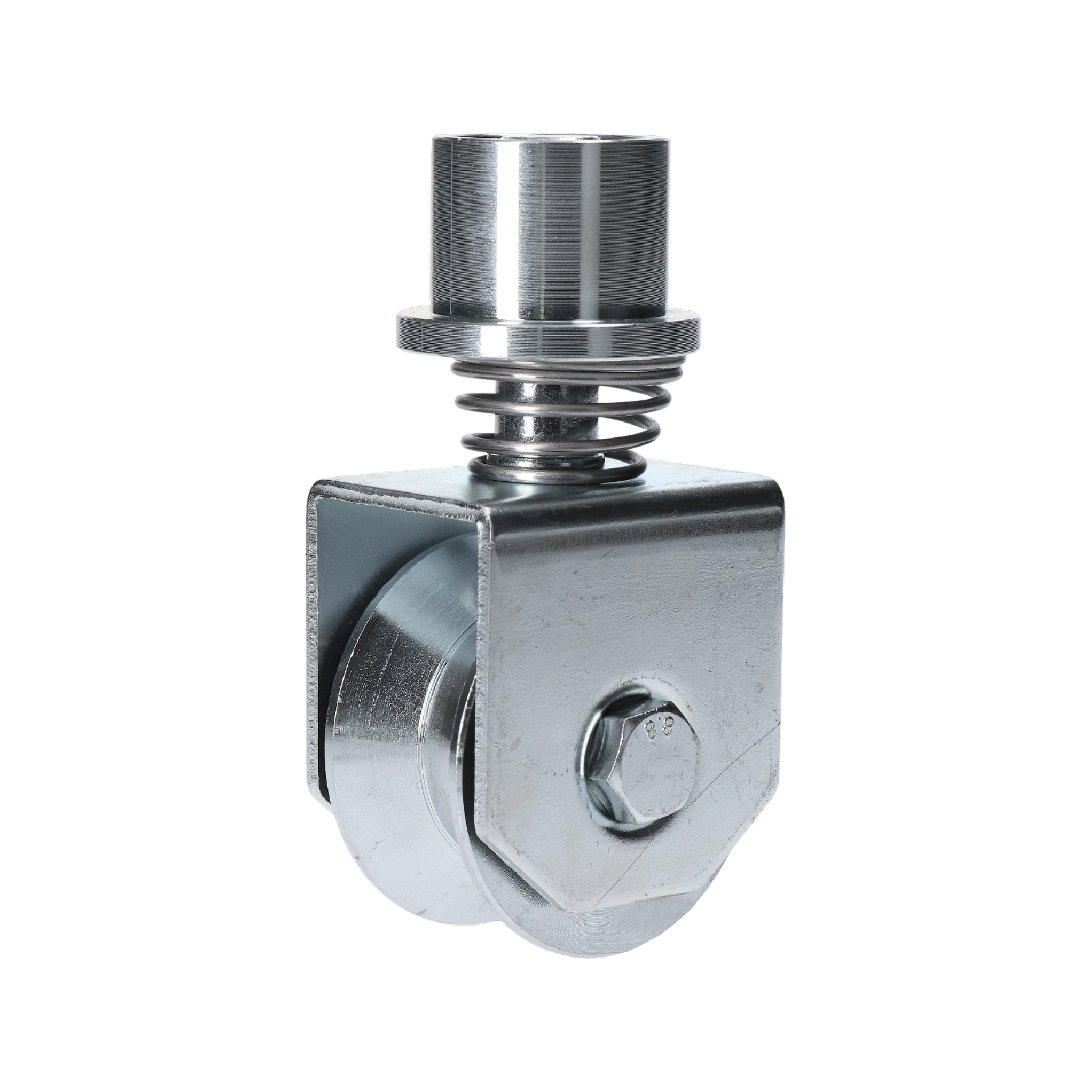 Otočné vodící kolečko použitelné pro U profily s ø20. Použitelný i pro obloukové vodící profily. Vodicí kolečko má drážku ve tvaru Y, čímž se sníží styčná plocha s obloukovým vodicím profilem a zajistí hladší přechod v případě, že je na vodicím profilu nános nečistot.