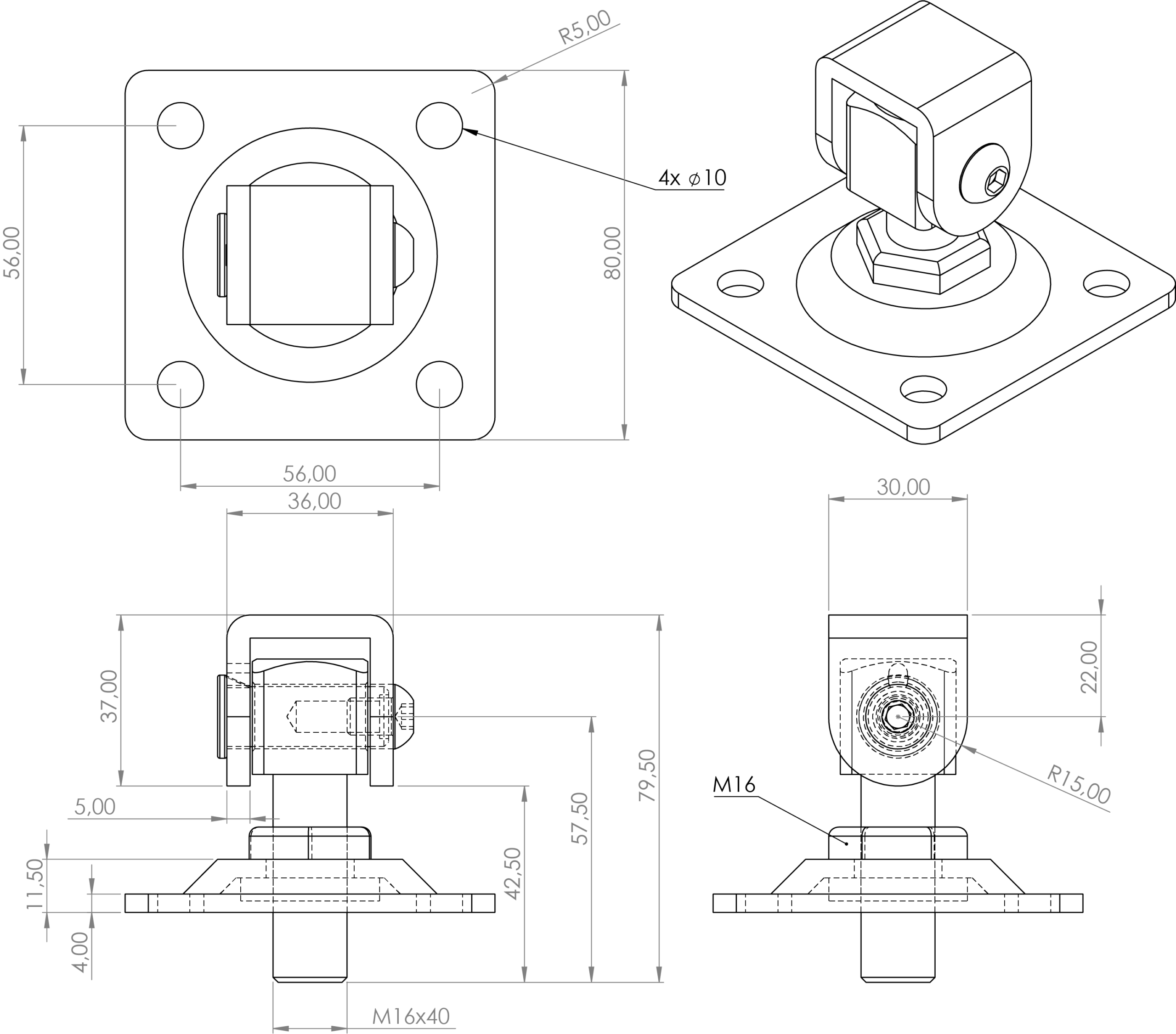 Závěs nastavitelný s plotnou 80 x 80 mm, závit M16, částečně pozinkovaný