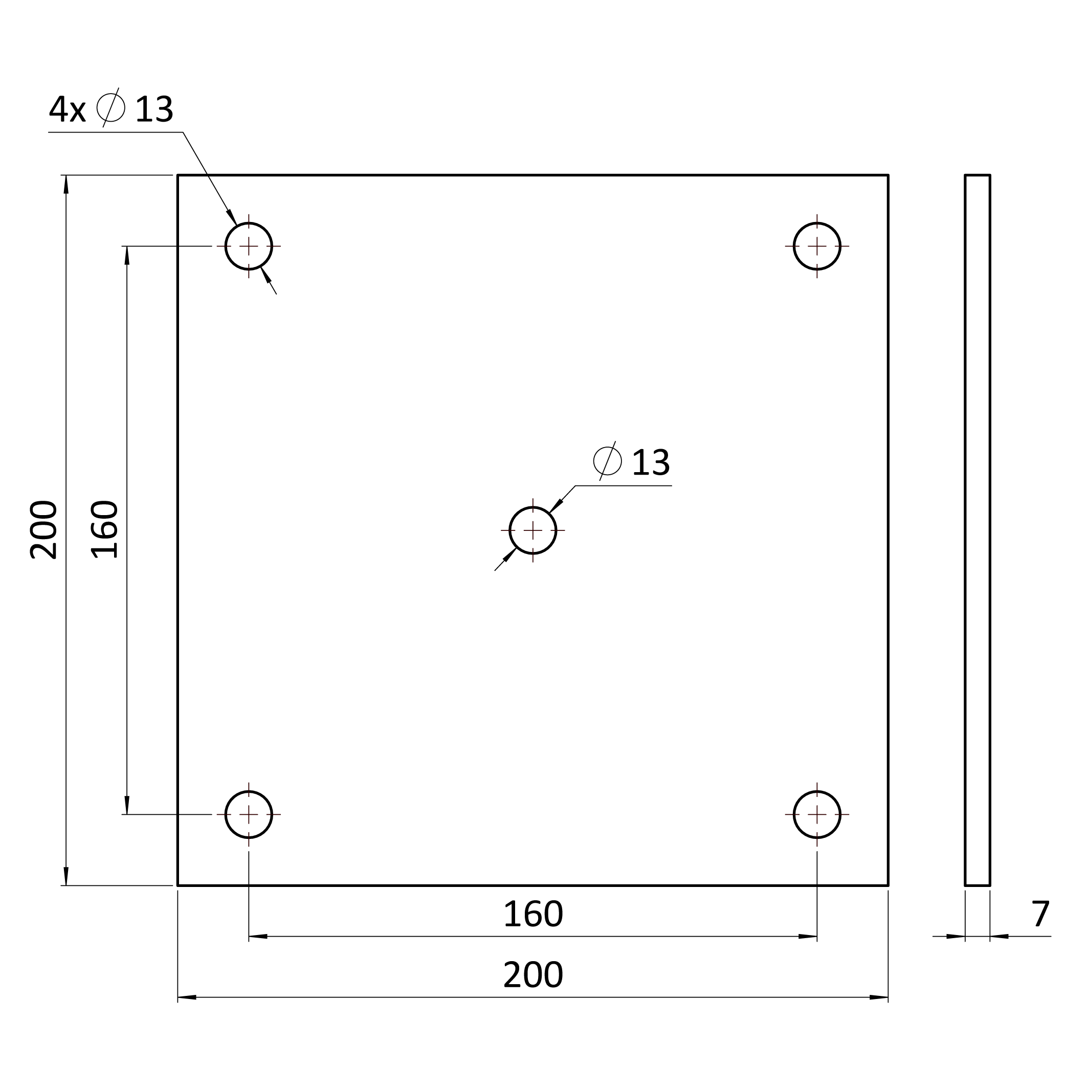 Plotna 200x200x7mm s otvormi 13mm, bez povrchový úpravy