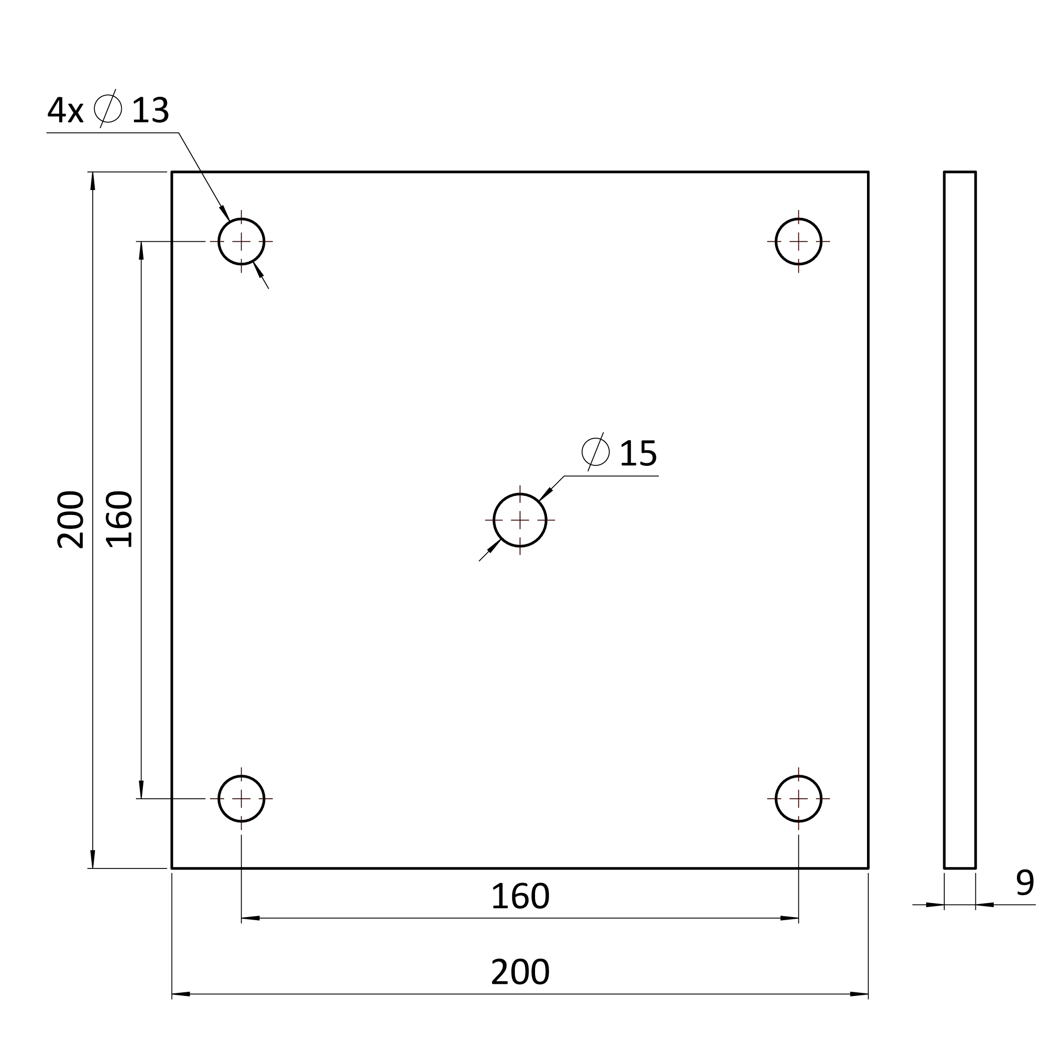 Plotna 200x200x9mm s otvormi 13mm, bez povrchový úpravy