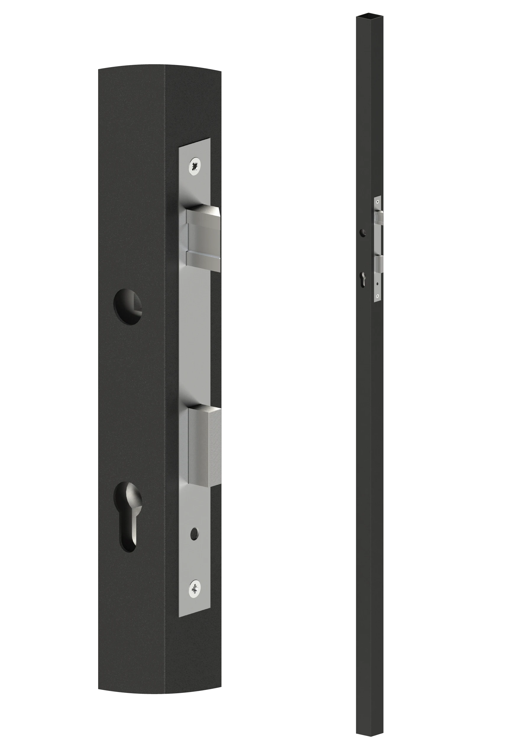 Profil 40 x 40 x 1,5 mm, výška 1500 mm, se zapuštěným zámkem určeným pro rám branky. Profil je dodáván bez povrchové úpravy. Zámek je oboustranný, vhodný pro pravé i levé otevírání. Dodává se bez vložky.