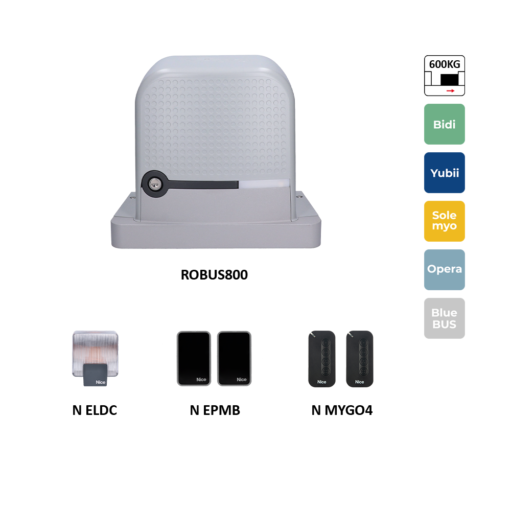 Robus800 je výkonný a spolehlivý automatický pohon určený pro posuvné brány s maximální hmotností až 600 kg. Tento model od společnosti NICE nabízí kombinaci vysoké rychlosti, výkonu a bezpečnosti, což z něj činí ideální volbu pro rezidenční i komerční použití.
