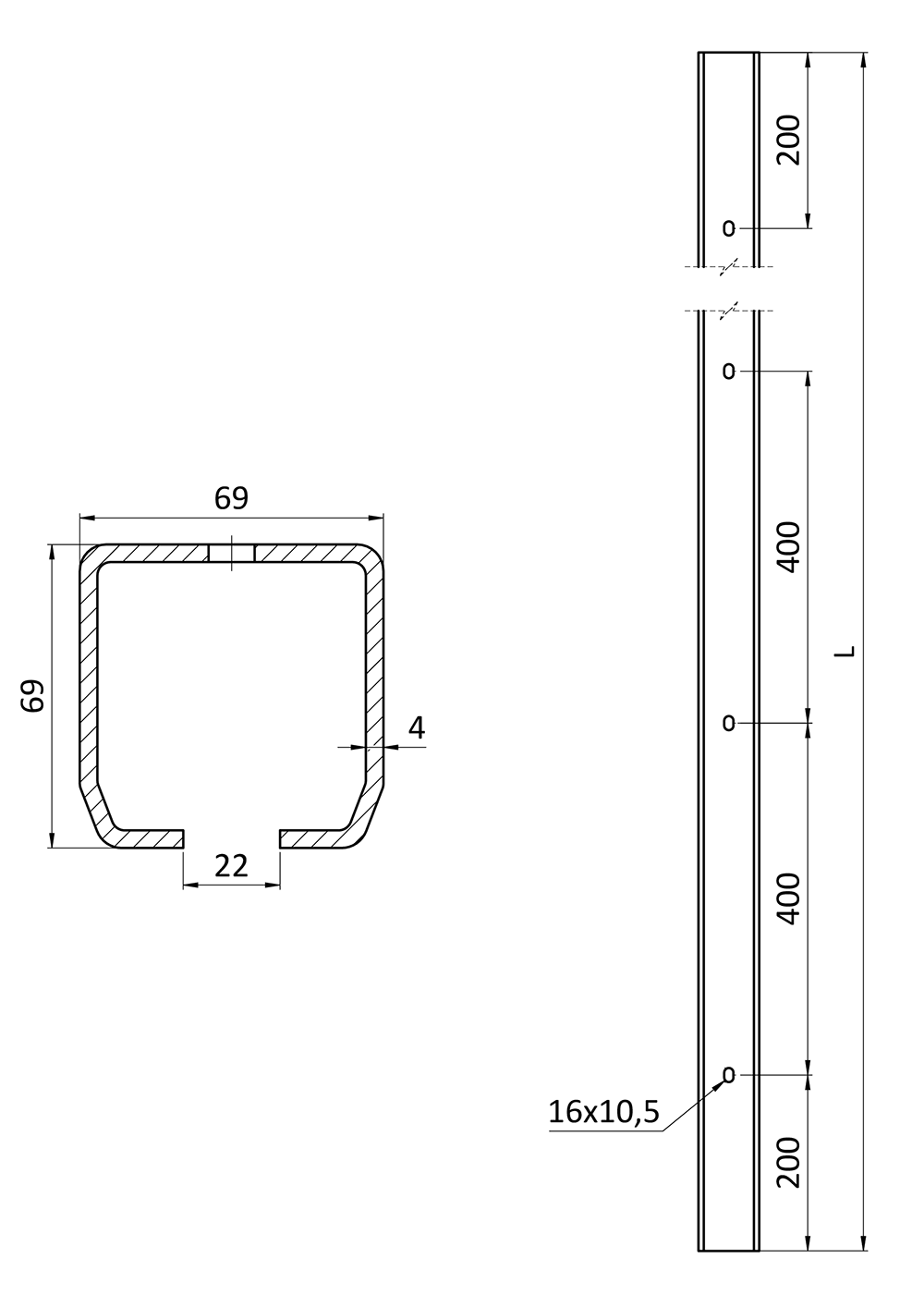 Samonos do 300 kg, děrovaný profil 69 x 69 x 6000 mm, Zn