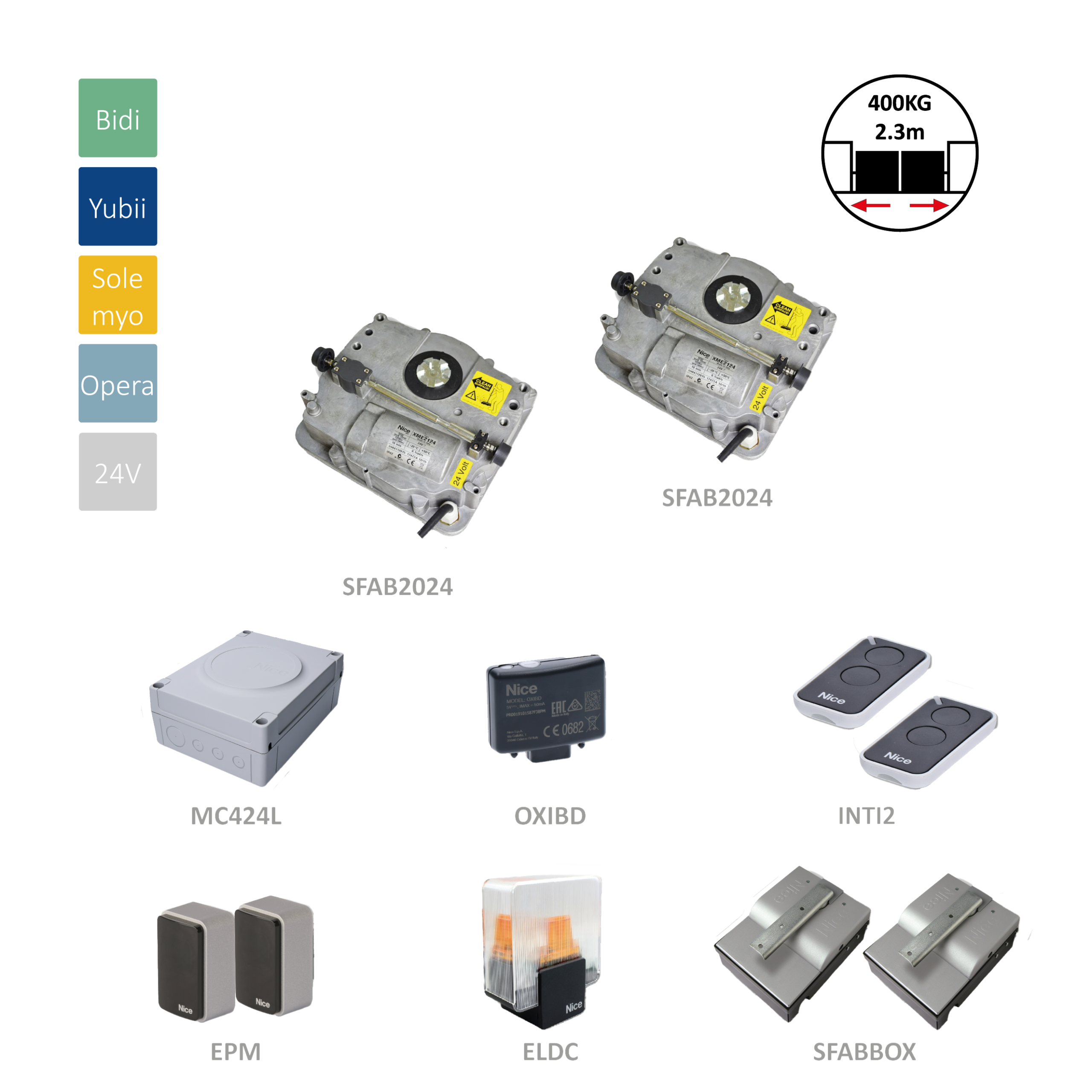 SFAB2024BDKCE podzemní sada pro dvoukřídlou bránu do 2,3 m / křídlo, 2x SFAB2024 (24 V, 120 W, 250 Nm), 1x MC424L, 2x INTI2, 1x OXIBD, 1 pár EPM,1x ELDC, 2x SFABBOX