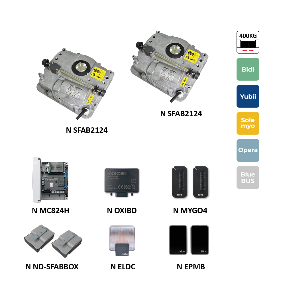SFAB2124BDKCE podzemní sada pro dvoukřídlou bránu do 2,3 m / křídlo, 2x SFAB2124 (24 V, 120 W, 250 Nm), 1x MC824H, 2x MYGO4, 1x OXIBD, 1 pár EPMB, 1x ELDC, 2x SFABBOX