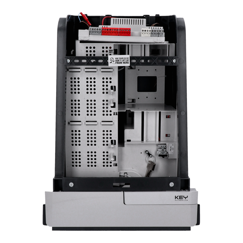 Uvnitř pohonu se nachází nízkonapěťový 24 V elektromotor s vysokým krouticím momentem, navržený pro dlouhodobé zatížení a časté cykly otevírání a zavírání. Motor je optimalizován pro plynulý rozběh a zastavení brány.