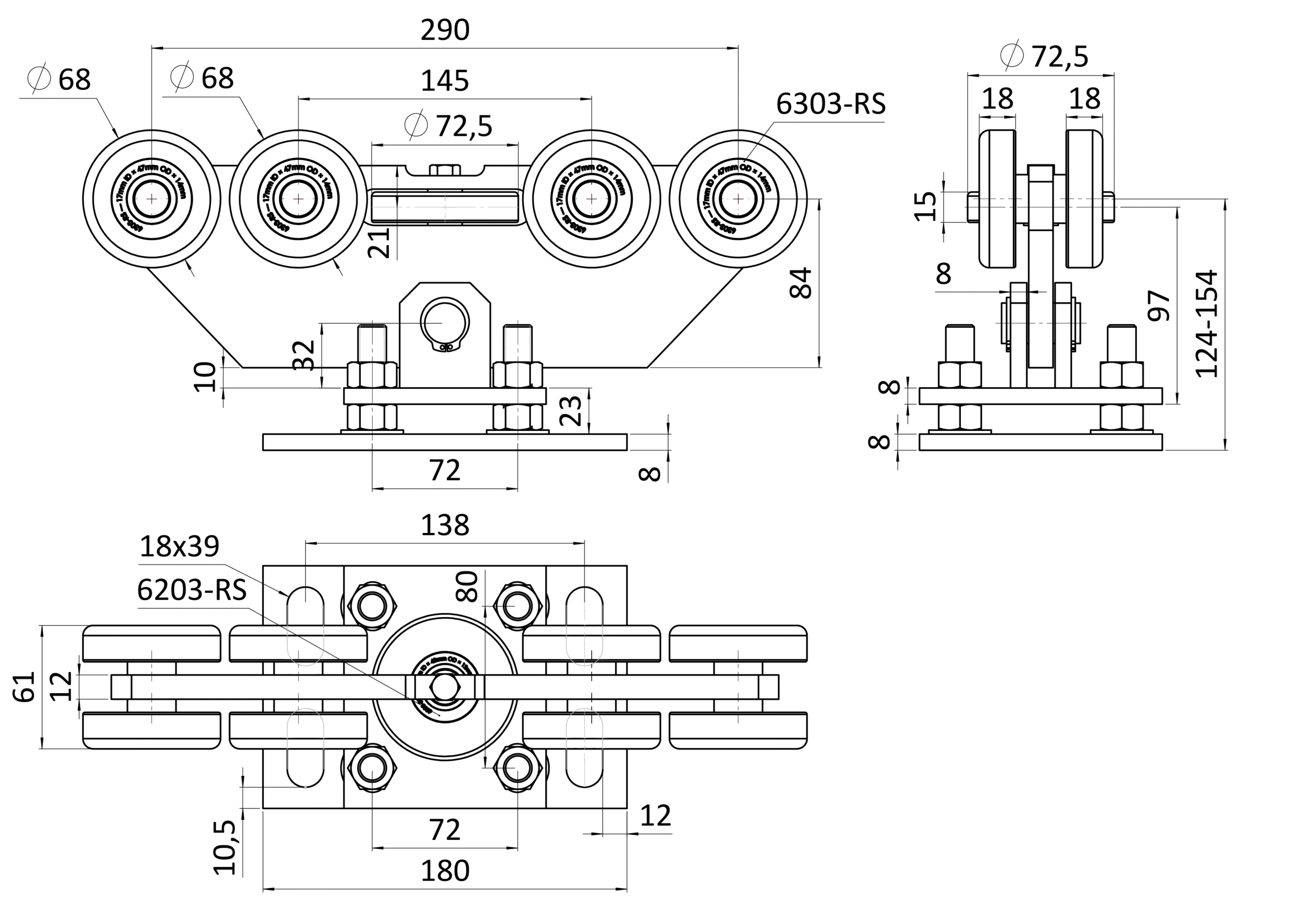 Vozík INTERMEDIO do 470 kg, nastavitelný, profil 80 × 85 mm