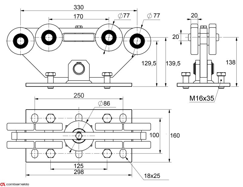 Samonosny systém vozíka od popredného talianského výrobcu Combi Arialdo. Povrchová úprava- pozink. Použitie pre posuvné brány. Kombinácia s kolajnicou C399M/Fe a C399M/Zn.