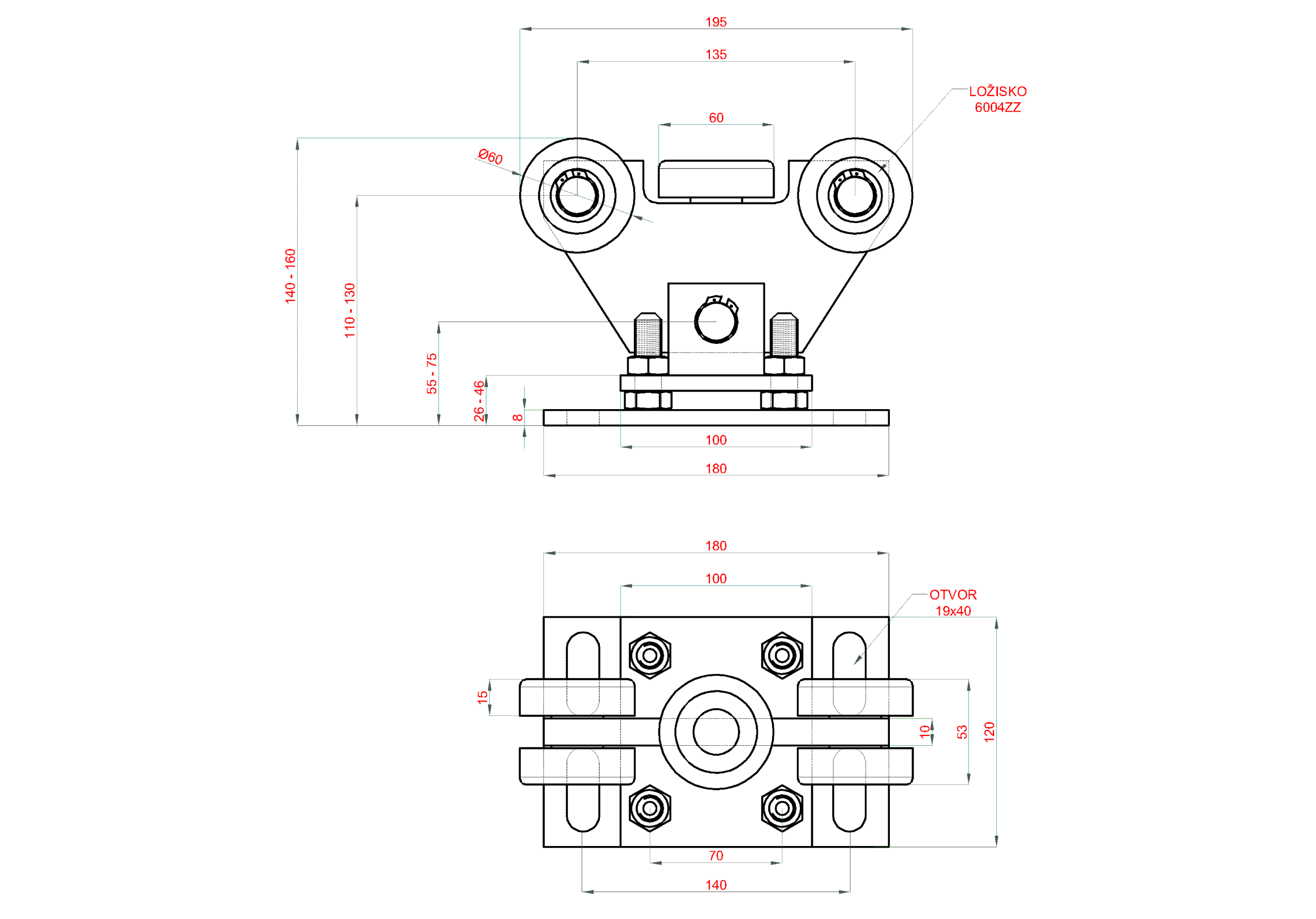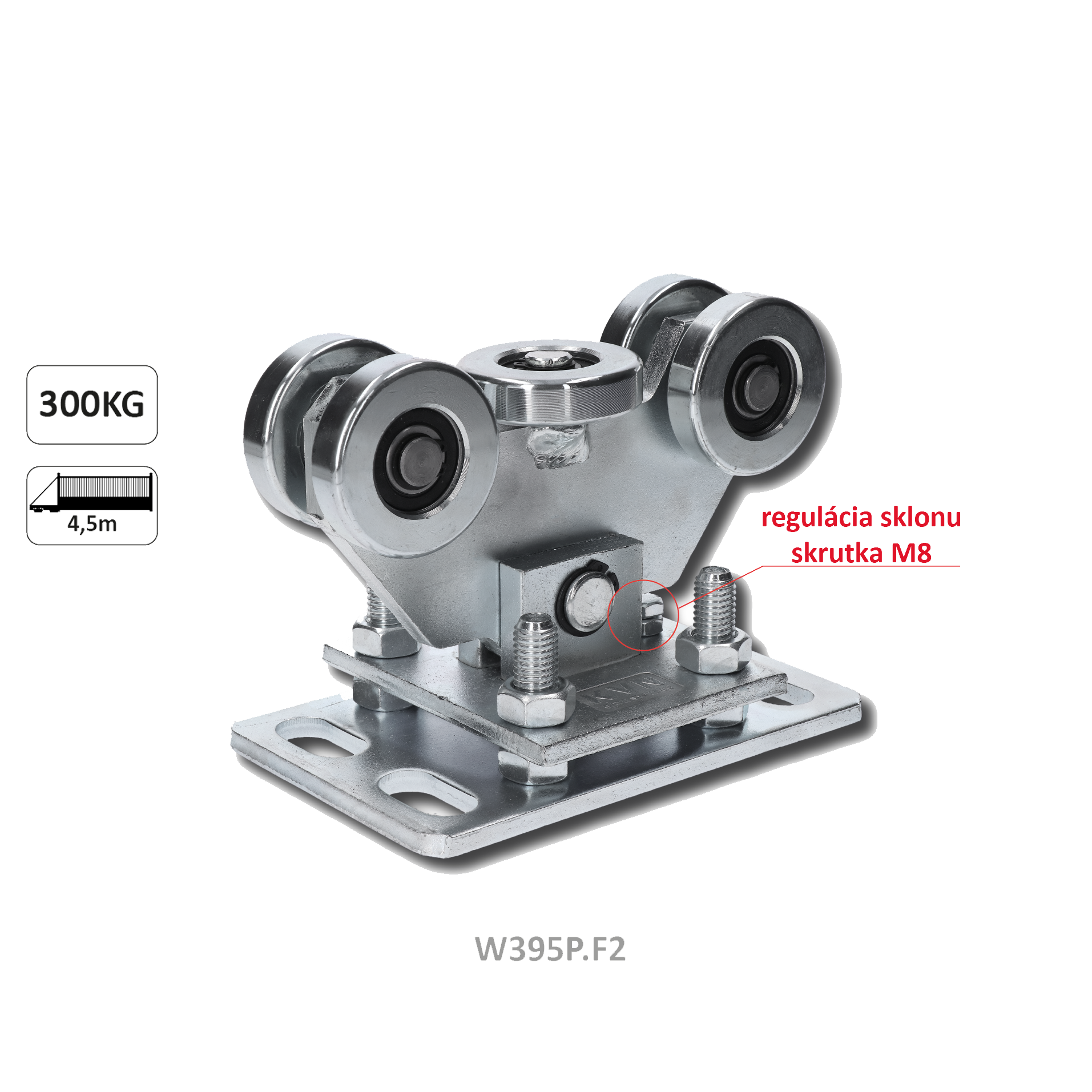 Vozík PICCOLO KLASIK pro C-profil 67 x 67/69 x 69 mm samonosného systému posuvných bran do 300 kg, s nastavitelnou deskou a dorazovým šroubem sklonu vozíku