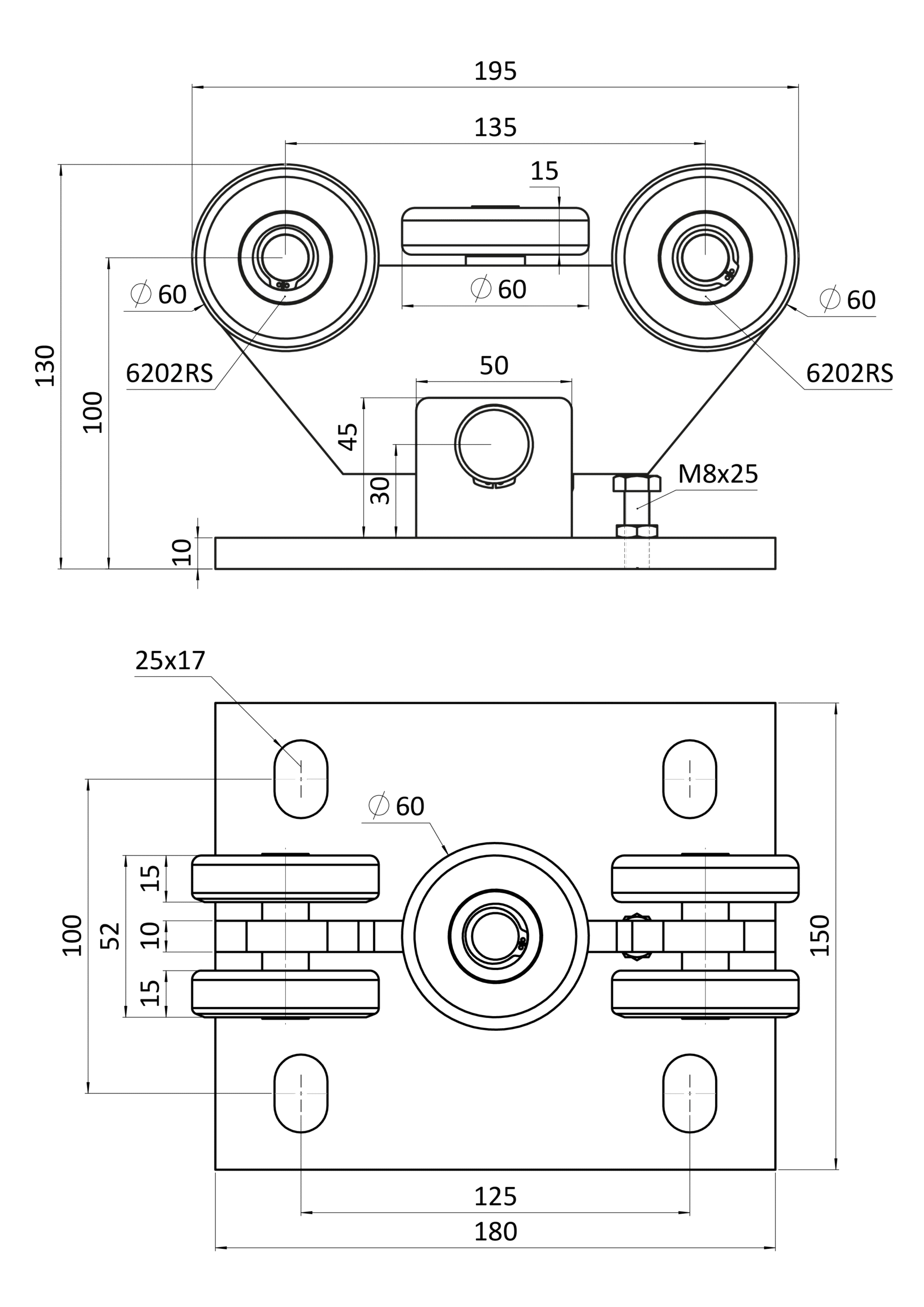 Vozík PICCOLO  do profilu (67x67mm) pro samonosné brány do 200kg/ otvor: 4.5m, nerez bez povrchové úpravy