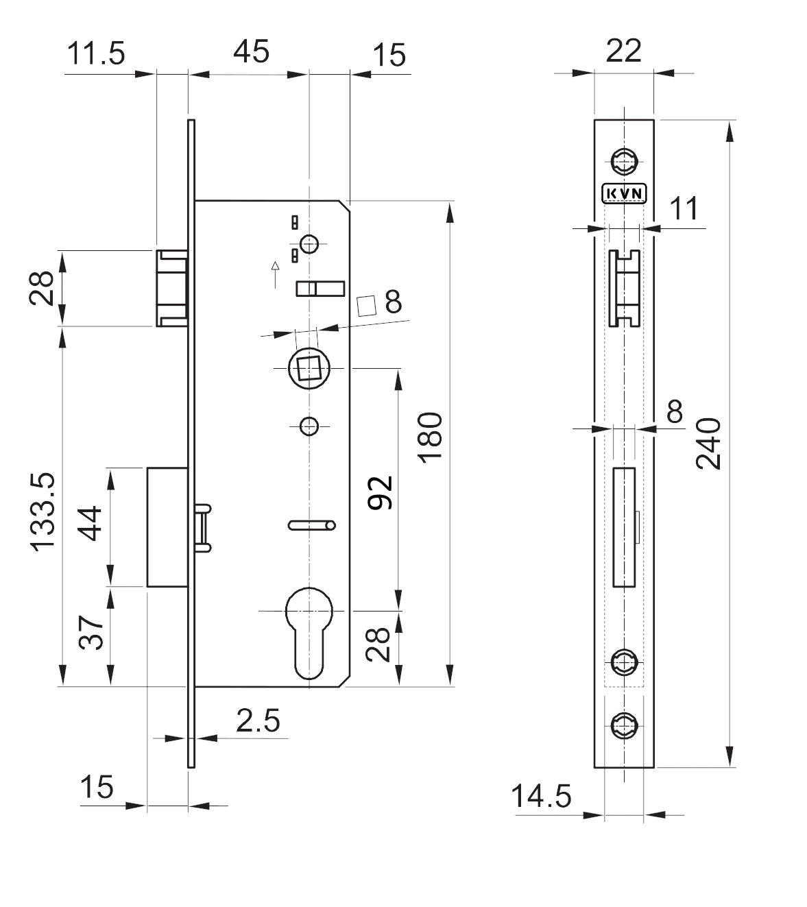 Zámek vložkový, zádlab 55 mm, rozteč 92 mm, poniklovaná čelní lišta