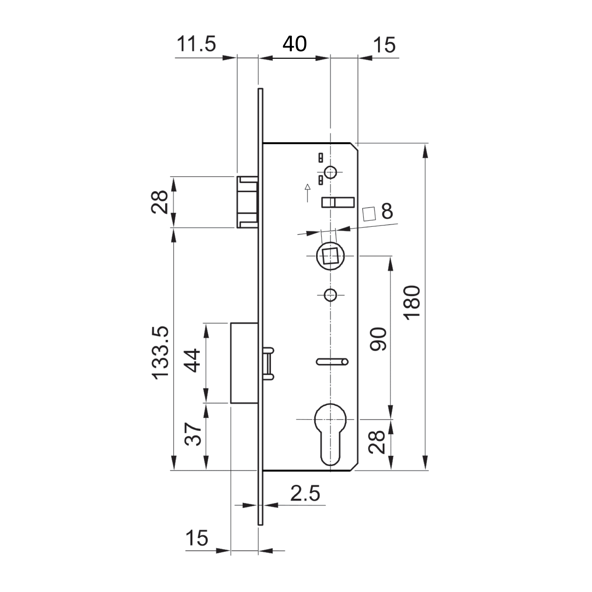 Zámek vložkový, zápust 55mm, rozteč 9...